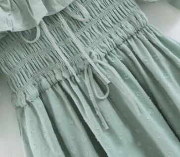 《入荷待ち》 全2色 レディース ワンピース ワンピ 5分袖 春 夏 ひざ丈 ミニ丈 ハイウエスト スクエアネック フリル フレアスカート ドット柄 水玉 お洒落 かわいい レトロ くすみカラー 透明感 清楚系 爽やか ナチュラル お出かけ デート ショッピング 女子会 リゾート 海水浴 海 ビーチ 春2020 夏2020 トレ定