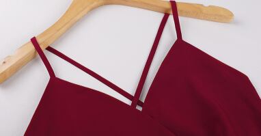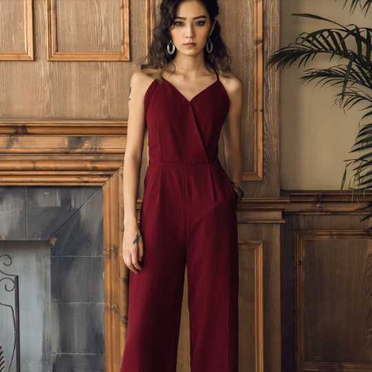 レトロなワインレッドが目を惹くオールインワンドレス。