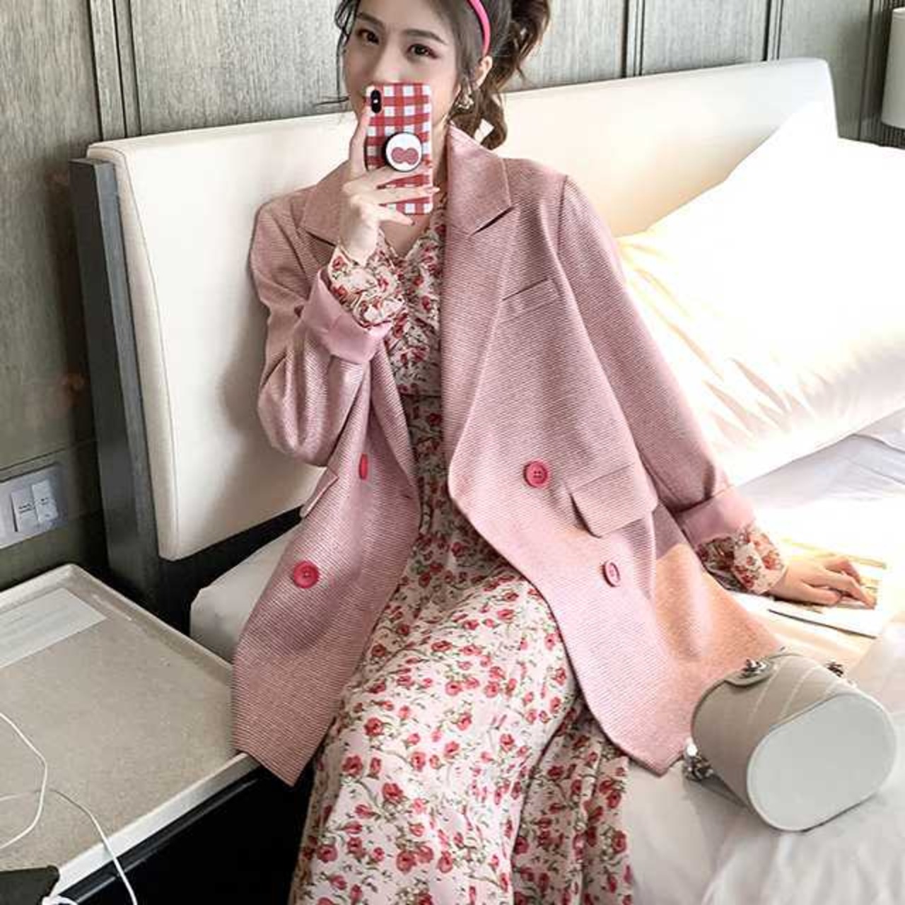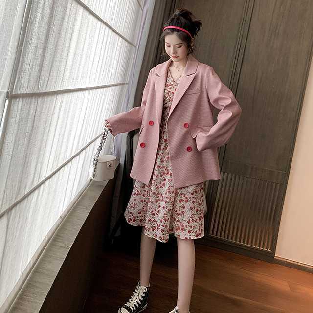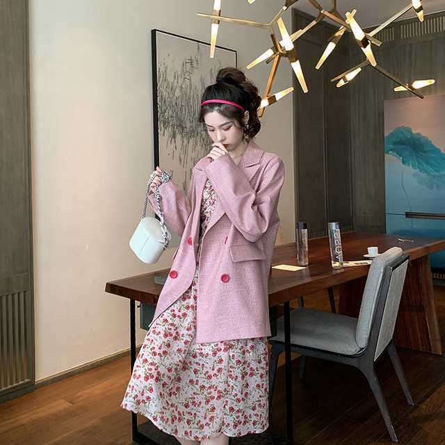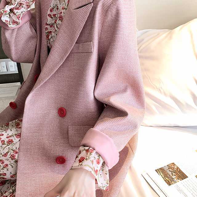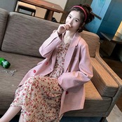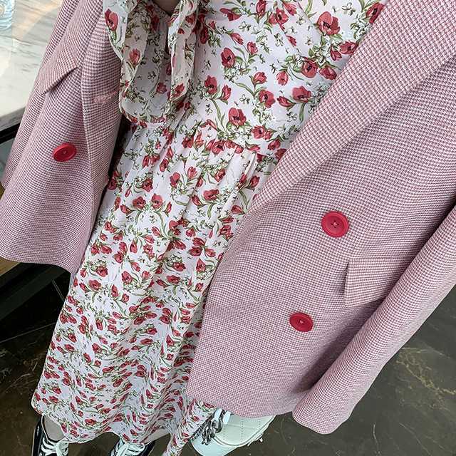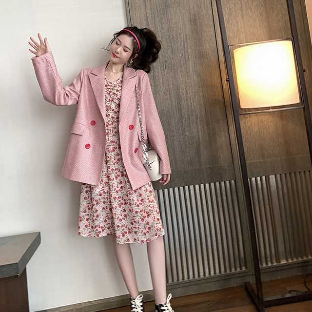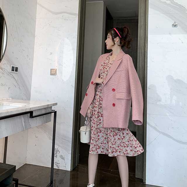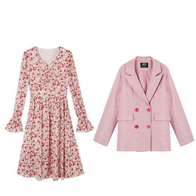ピンクのテーラードジャケットと小花柄のシフォンワンピースのセットアップ。