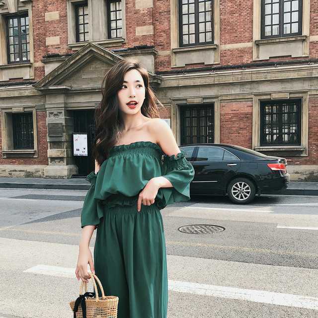 《再入荷》ツーピース セットアップ オフショルダー フリル シフォン ワイドパンツ シャーリングゴム デタッチドスリーブ フレアスリーブ トップス 無地 シック レトロ かっこかわいい リゾート 海 おでかけ バカンス 旅行 セクシー ウエストゴム ラフ 夏2020 トレ定