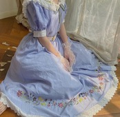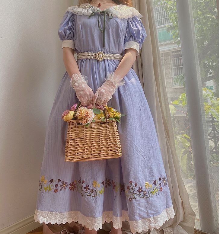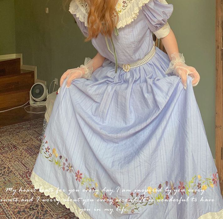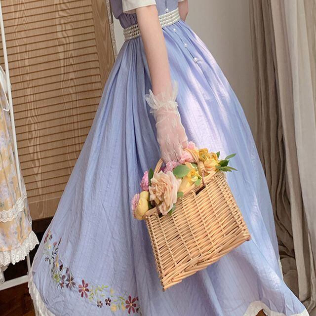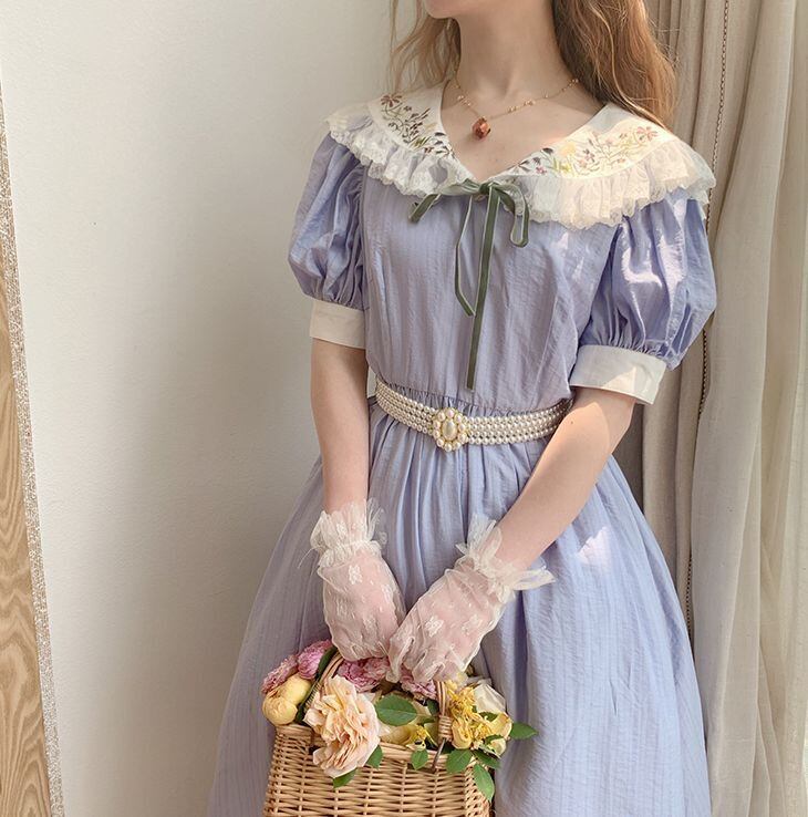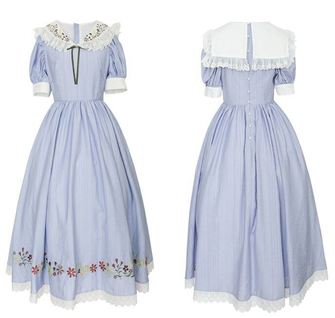 《入荷待ち》 ウエスト切り替え ミディアム丈 ワンピース ドレス ブルー フレア 半袖 セーラー リボン フラワー刺繍 バイカラー レトロ レディース 休日 誕生日 女子会 イベント 夏2020 夢かわ