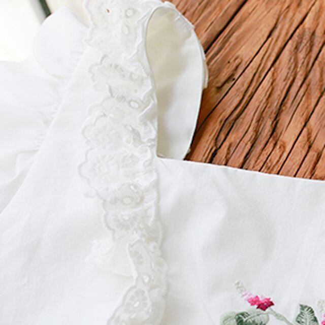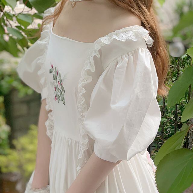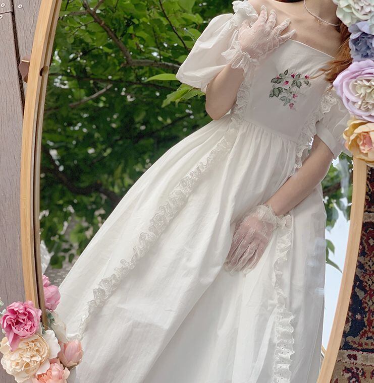 《入荷待ち》 ウエスト切り替え オフショルダー スクエアネック ワンピース ドレス ロング フリル 刺繍 花柄 コットン 半袖 ホワイト 白 レディース お姫様 レトロ ロリータ 誕生日 女子会 お呼ばれ 夏2020 夢かわ