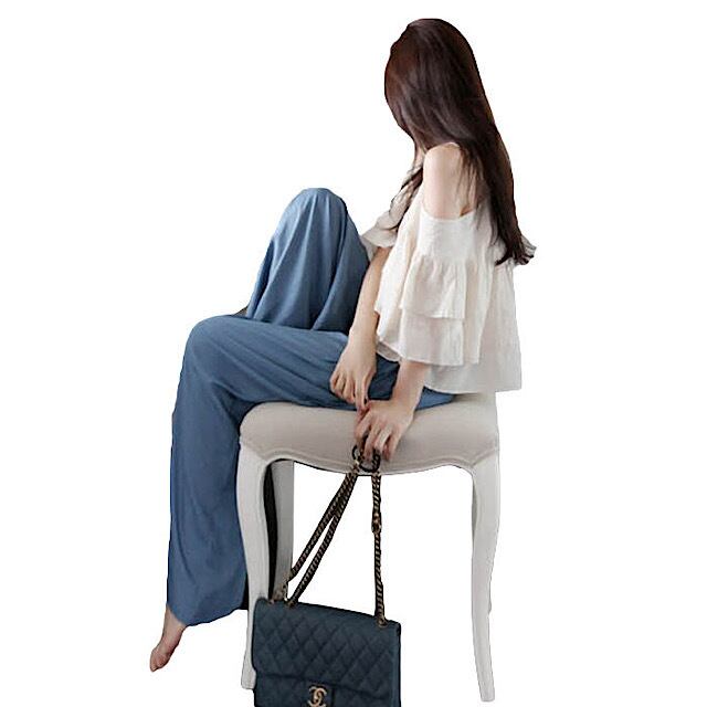 ブルーのパンツはサラッと質感で見た目も触り心地も涼やかです。