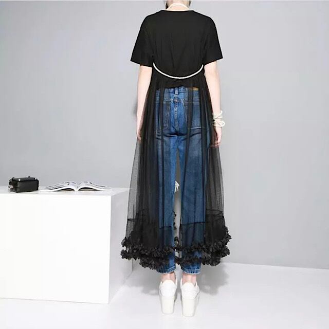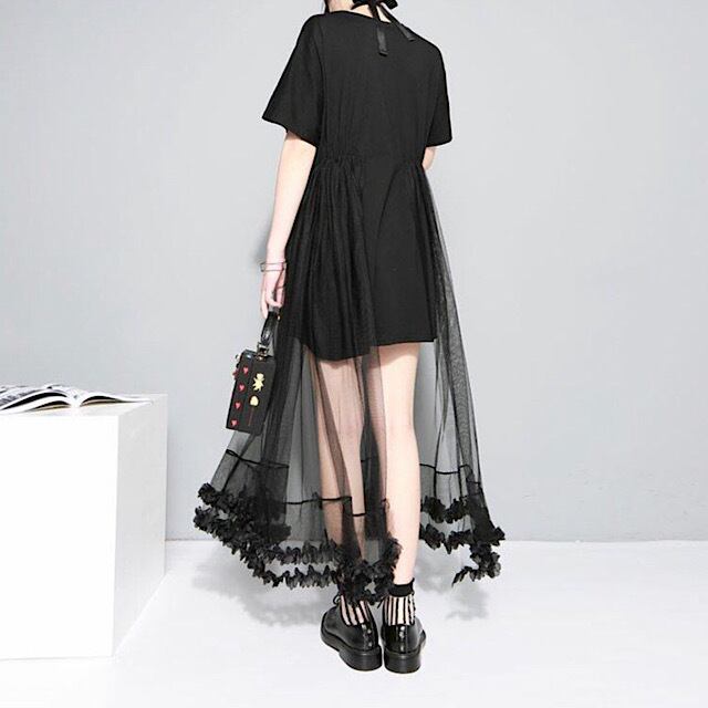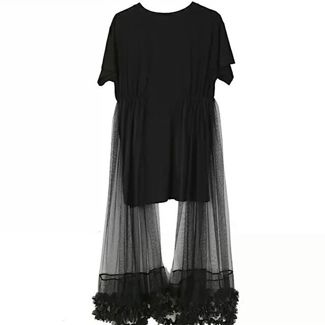 風になびくチュールが大人可愛いブラックのワンピースです。