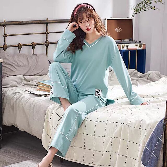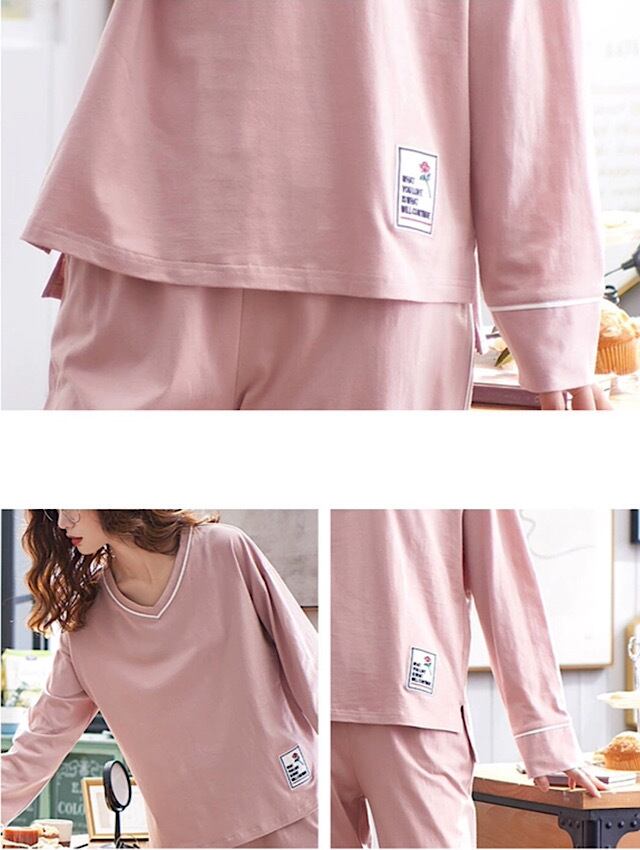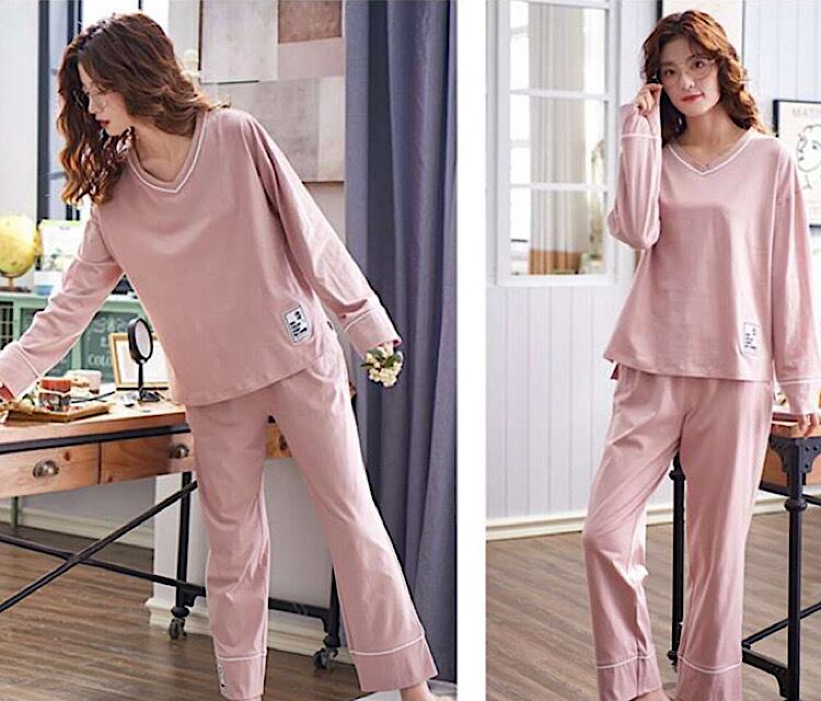 レディース コットン パジャマ Vネック 無地 長袖 秋 シンプル 無地 部屋着 ルームウェア Roomwear