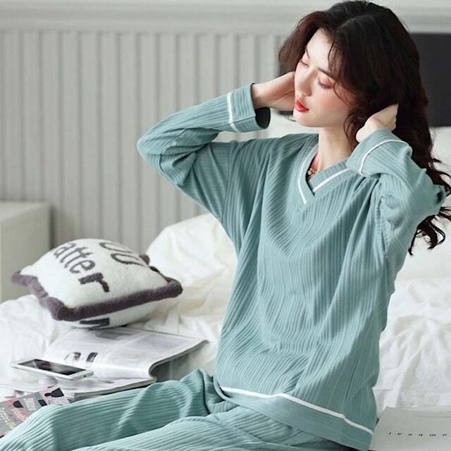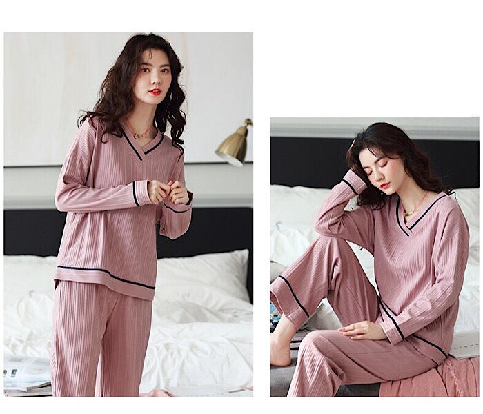 レディースコットン パジャマ Vネック 無地 長袖 夏 秋 シンプル 無地 バイカラー 大人女子 Roomwear