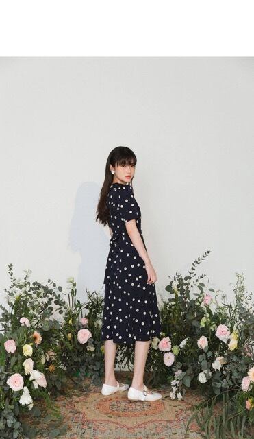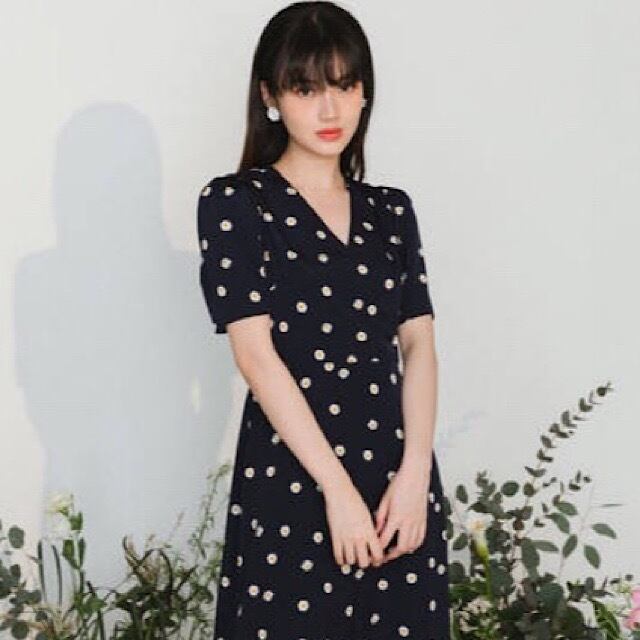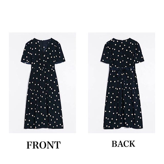 ドット柄が大人可愛いひざ丈ワンピースです。