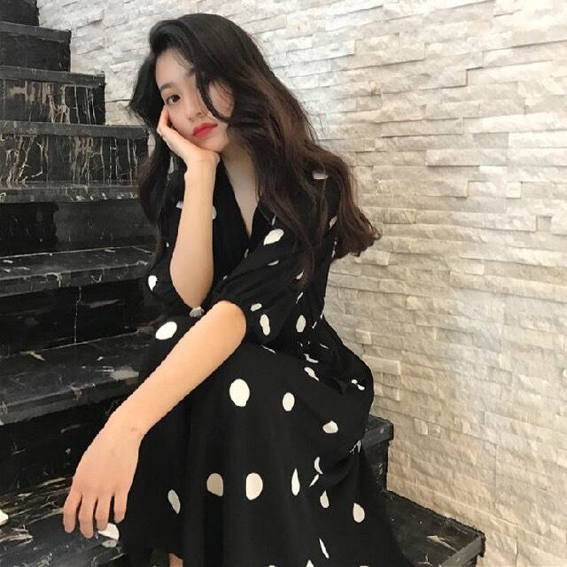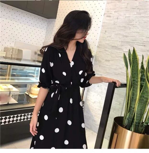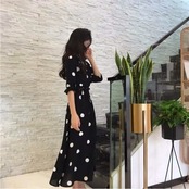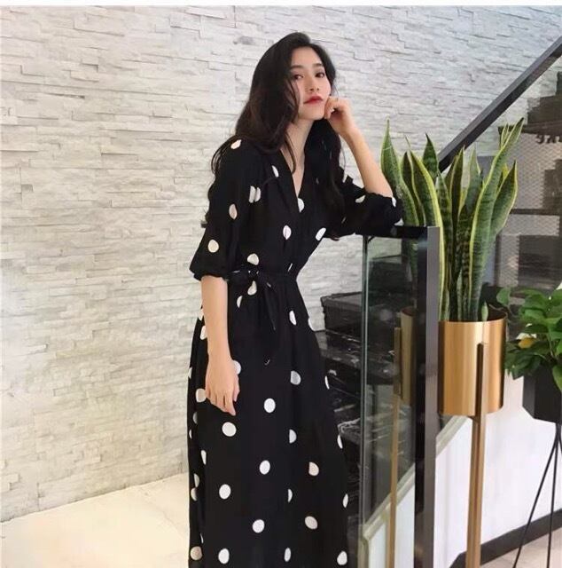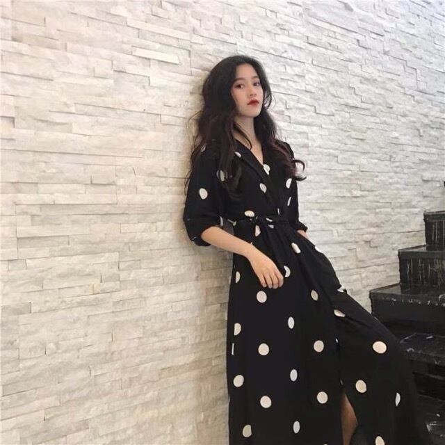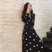 《入荷待ち》大きいサイズ カジュアル レディース ロング丈 七分袖 Vネック バイカラー 2020秋 新着 ドット ワンピース