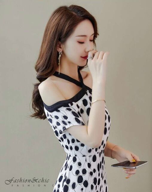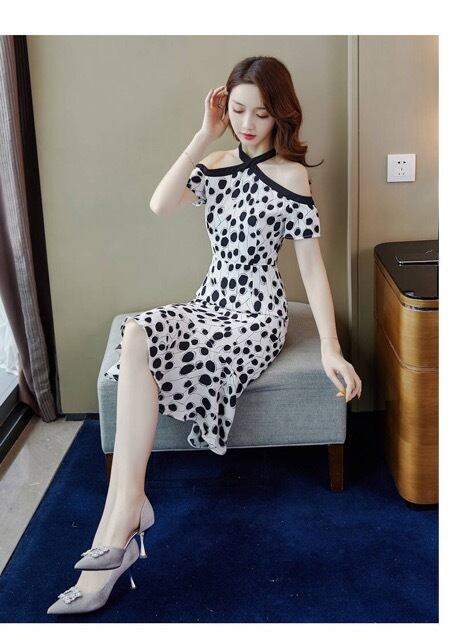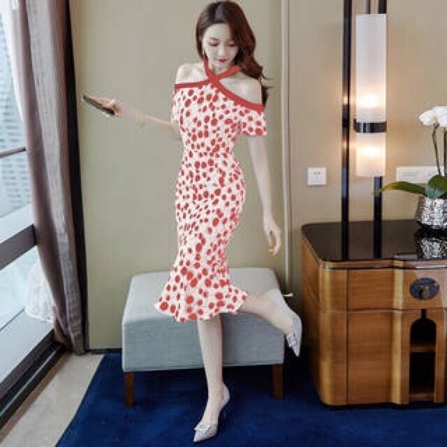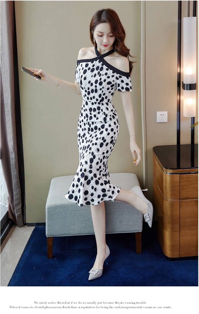 《入荷待ち》 大きいサイズ レディース ホルダーネック マーメイドフレアー ロング丈 セクシー大人可愛い 2020秋 新着 ドット ワンピース ドレス オフショル 半袖