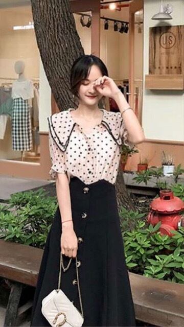 アプリコットは首周りのフリルが柔らかな印象。ふんわりフェミニンコーデを楽しめます。