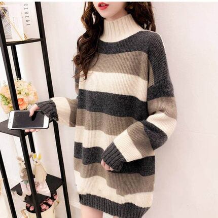《入荷待ち》全2色 レディース ハイネック タートルネック 長袖 ニット セーター ボーダー オーバーサイズ ビッグシルエット ナチュラル 通勤 女子会 秋 冬 2020冬 新着 トレ定