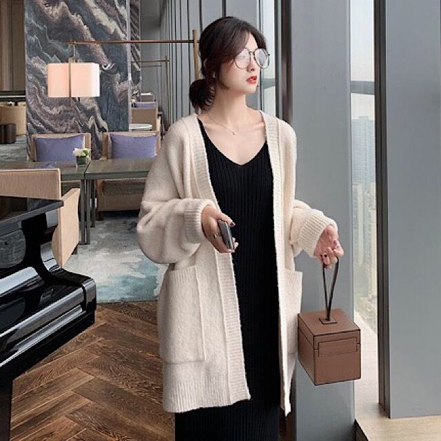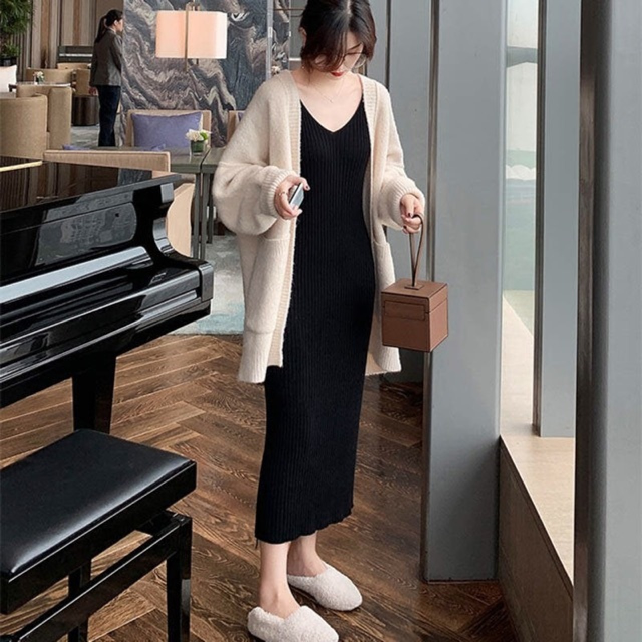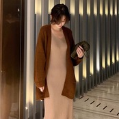 季節の変わり目に重宝するニットワンピースとカーディガンのセット商品。