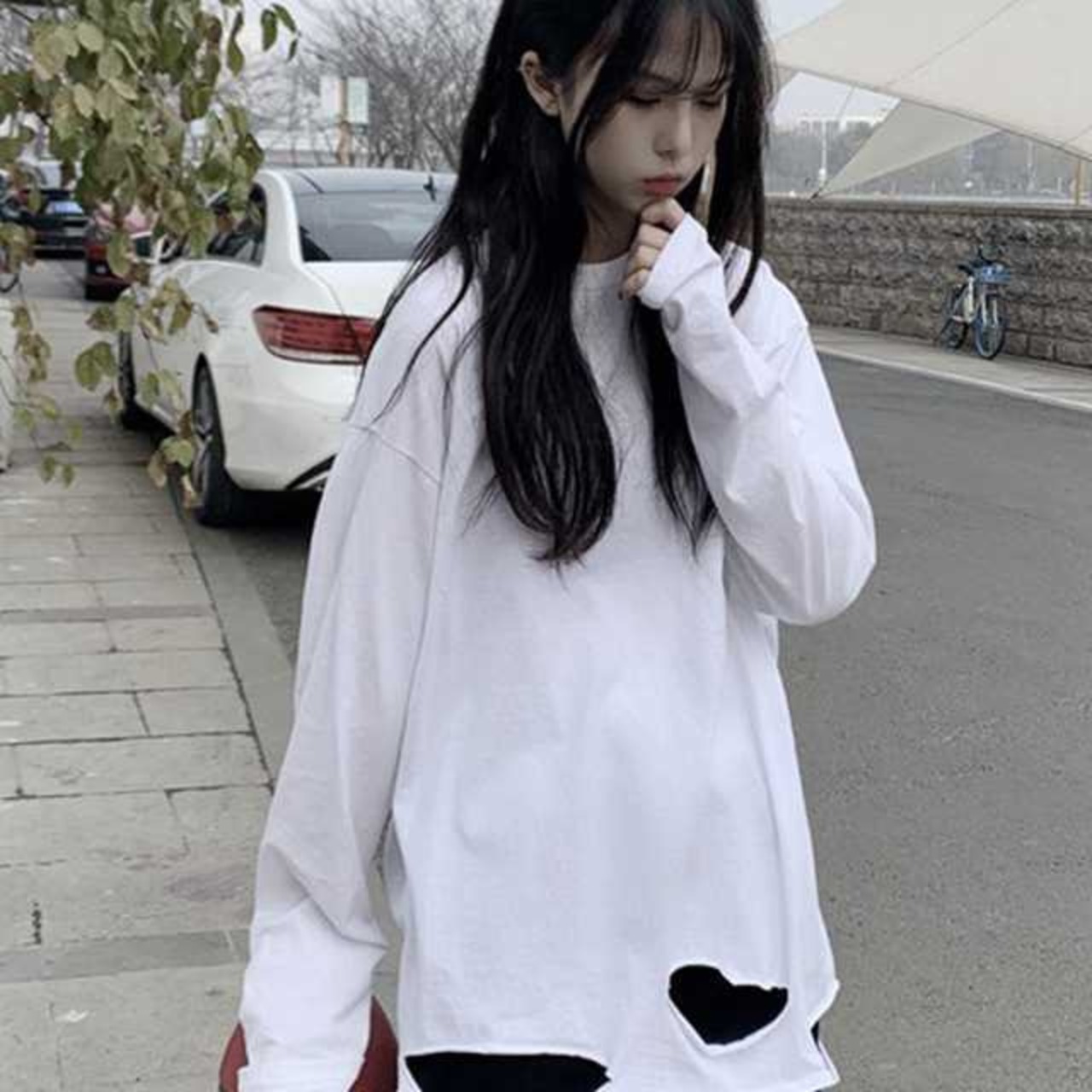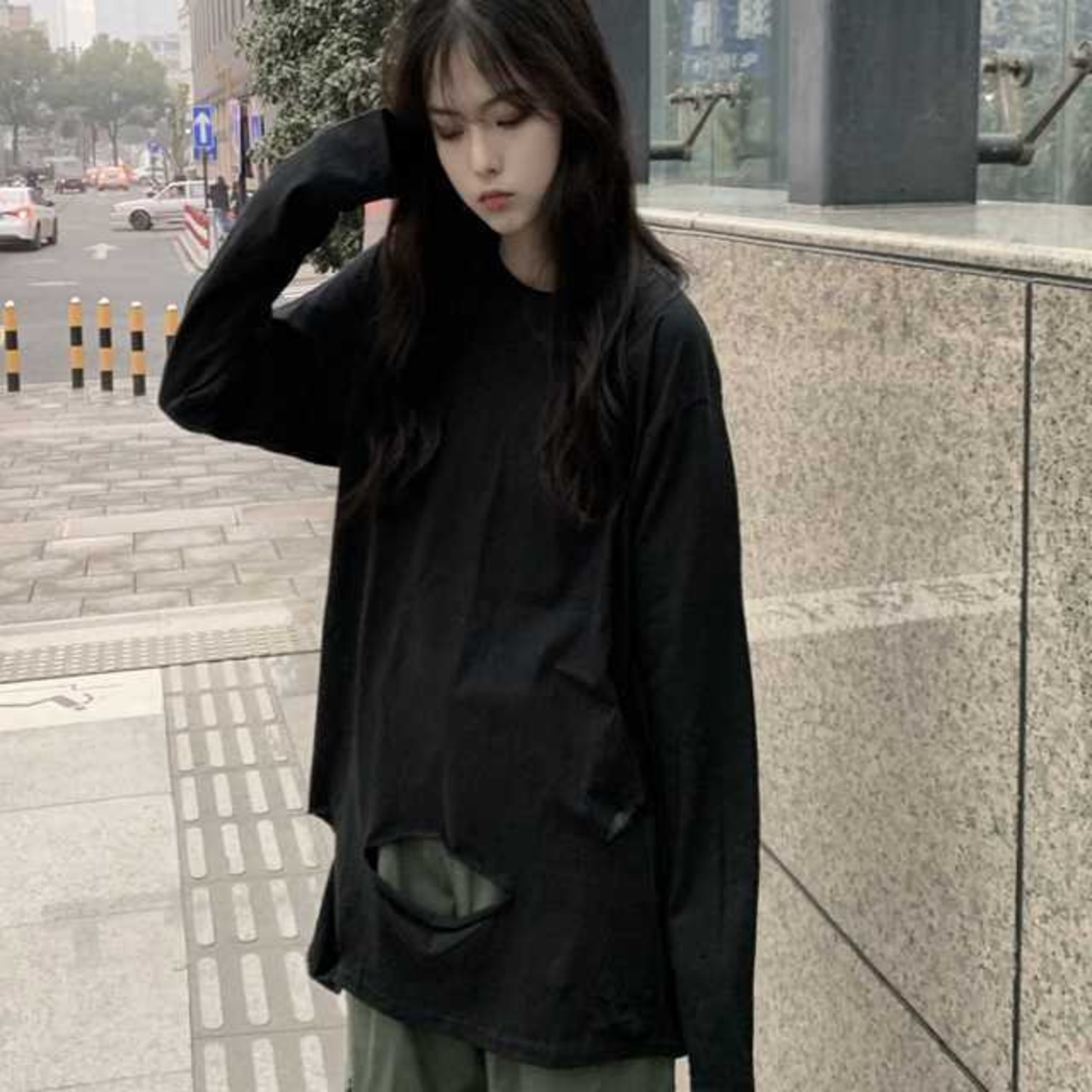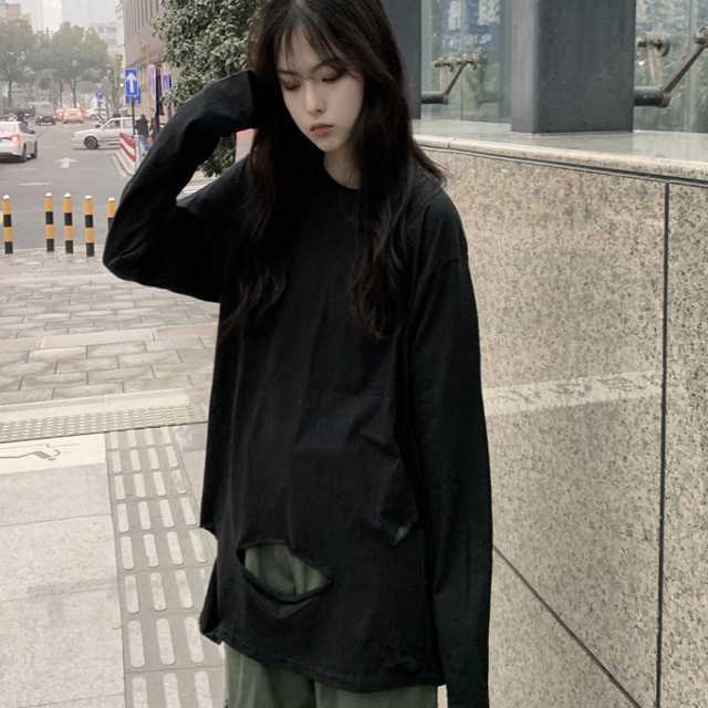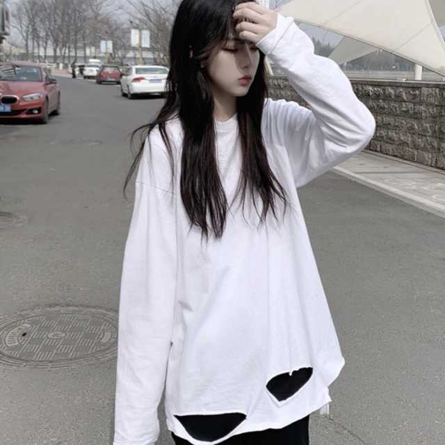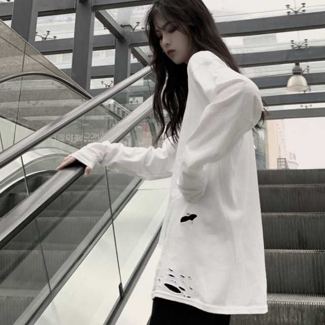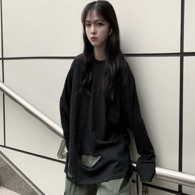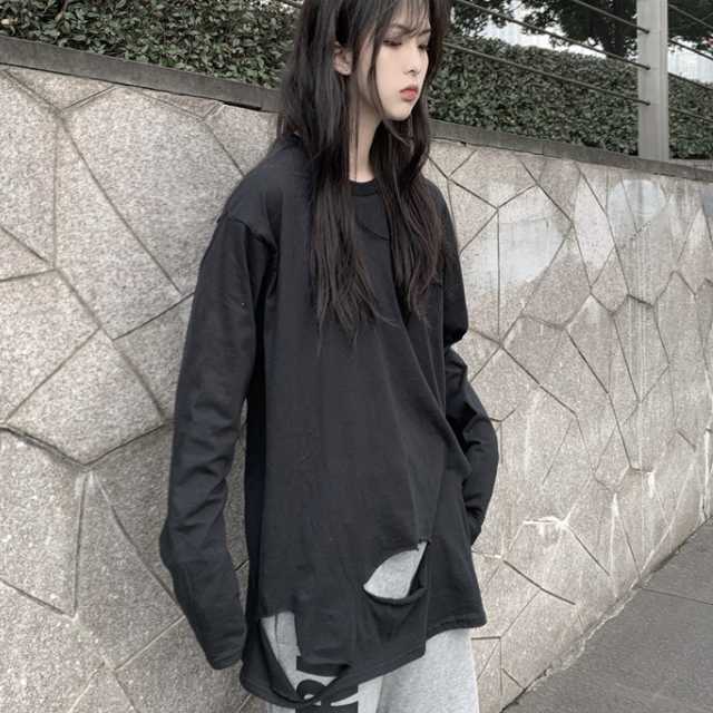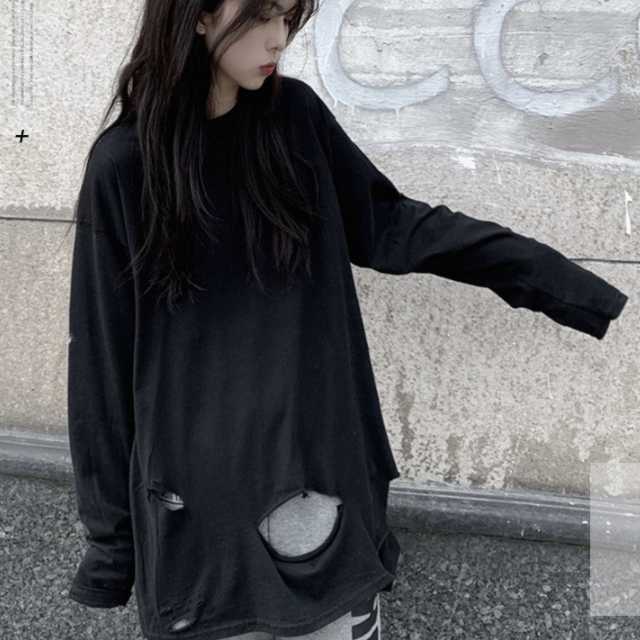 《再入荷》 全2色 レディース カットソー トップス ダメージ ロング丈 ロングカットソー レイヤード 大きめ ゆったり 体型カバー メンズライク オーバーサイズ カジュアル シンプル 無地 ストリート トレ定 かわ大