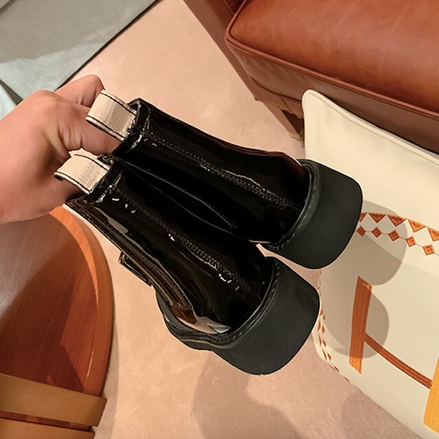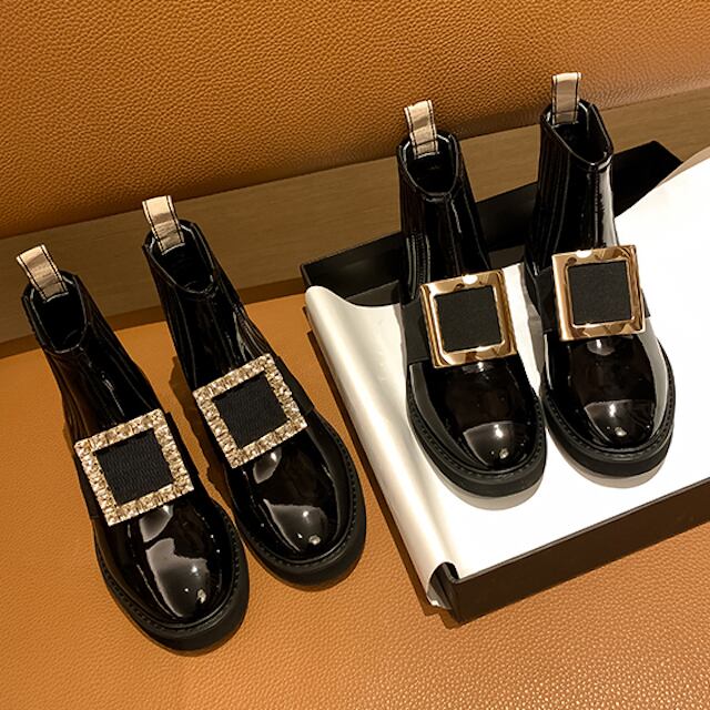 全4タイプ レディース ショートブーツ 光沢 スクエアチャーム 内ボア 軽量 モード シンプル メンズライク 2020秋 2020冬 新着 トレ定