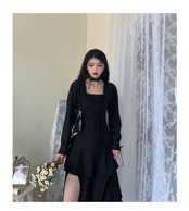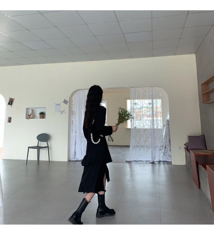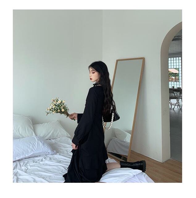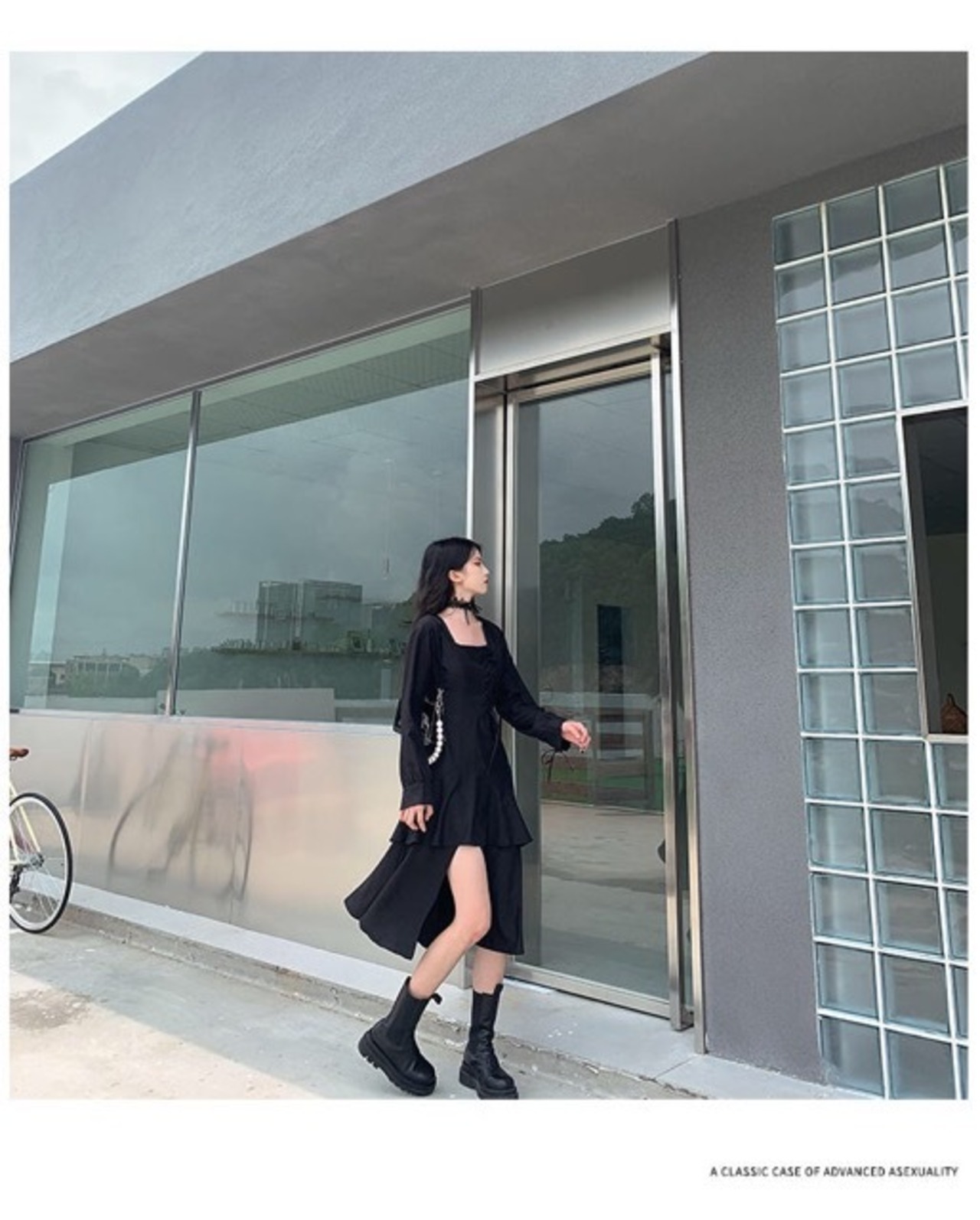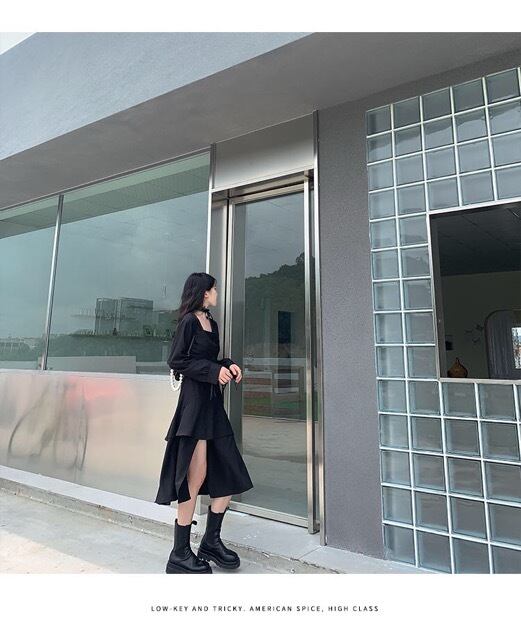 《入荷待ち》大きいサイズ レディース モノトーンカラー スクエアネック ワンピース ハイウエスト切り替え 個性的 フィッシュテール アシンメトリー シック 黒 2020秋 2020冬 新着 トレ定 夢かわ