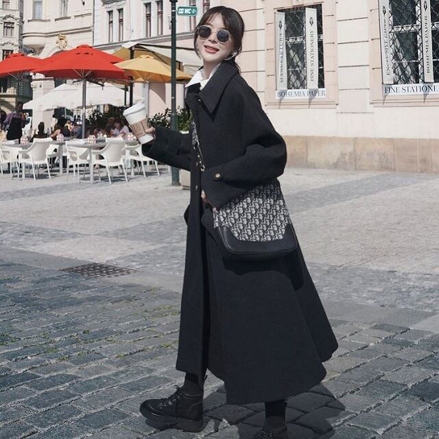 大きな襟とゴールドのボタンがアクセントになりますね。