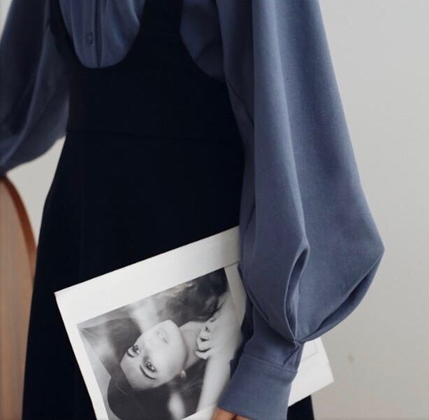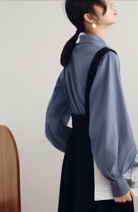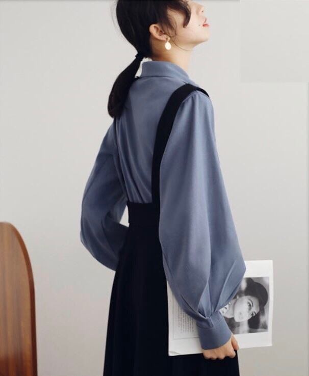 腕をほっそり見せてくれるパフスリーブと大きな襟が特徴の長袖ブラウス。