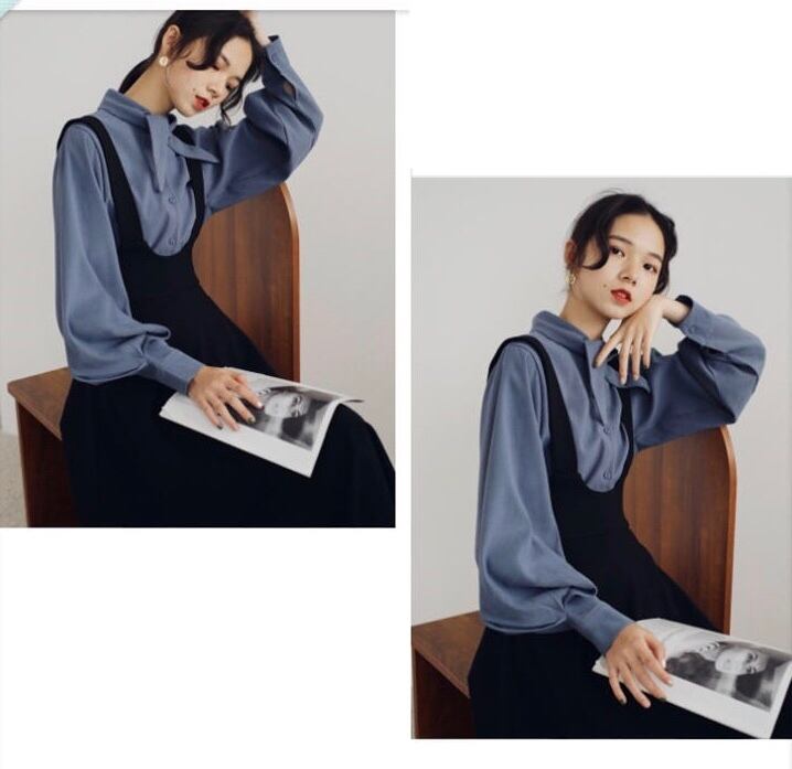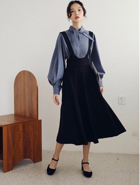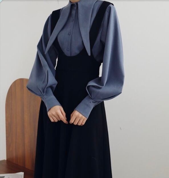 ダークグレーのブラウスとブラックのワンピースのセットアップ商品です。