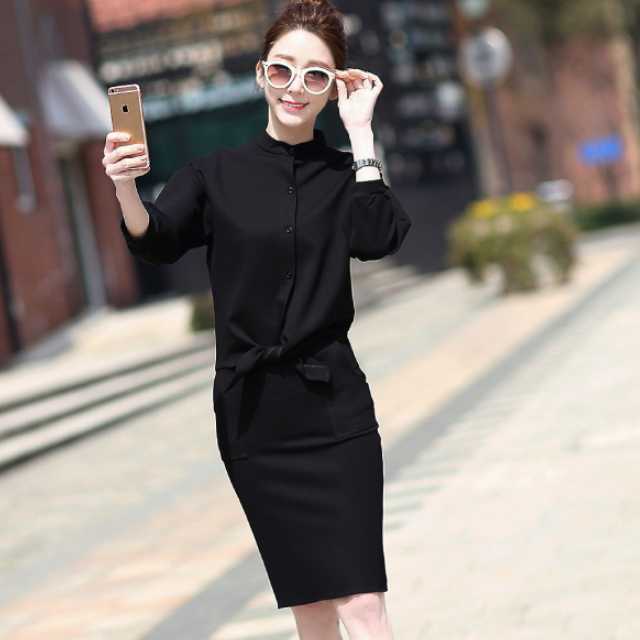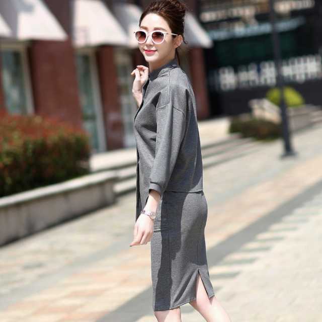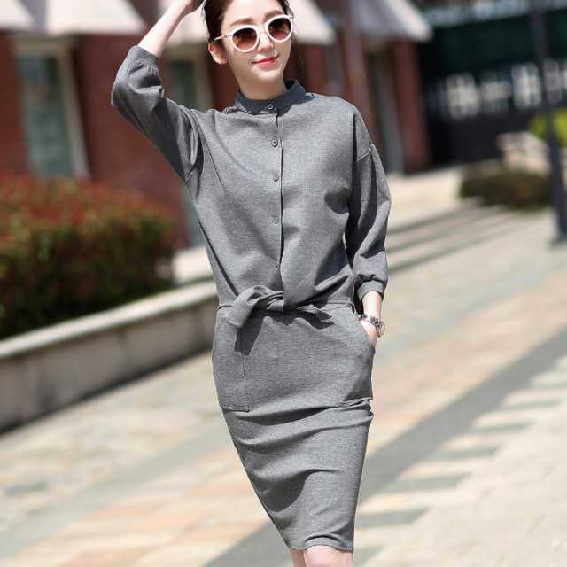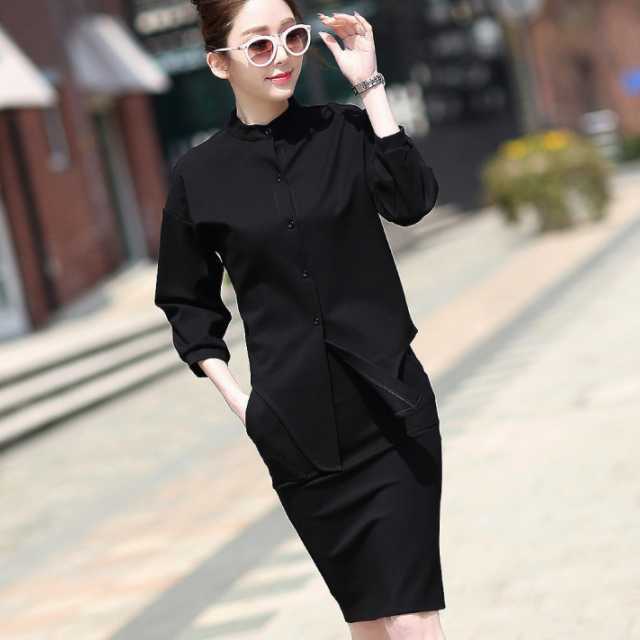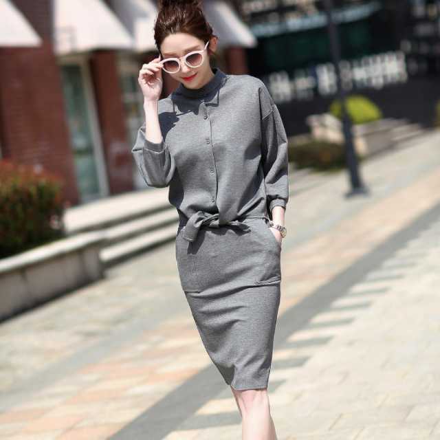 全2色 大きめサイズ セットアップ スカート ワンピース風 レディース ミモレ丈スカート トップス 七分袖 2点セット コットン ハイネック タイトスカート ミモレ丈 秋 冬 通勤服 カジュアル 普段着 着回し シンプル トレンド セットアップ トレ定 かわ大