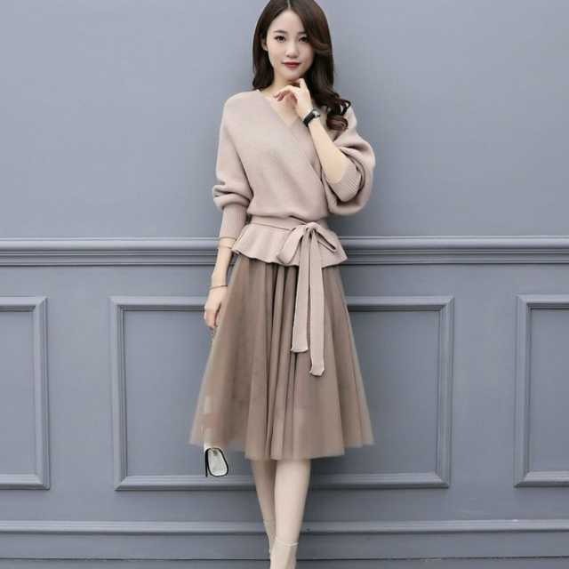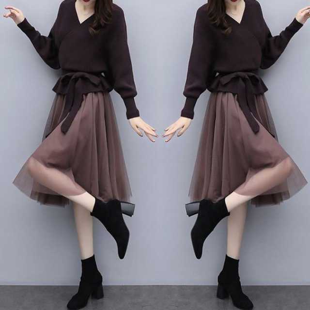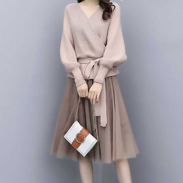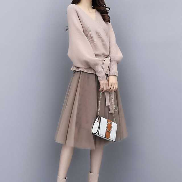 全2色 大きめサイズ セットアップ レディース ニットトップス vネック 長袖 ウエストリボン セーター チュールスカート 膝丈スカート ミモレ丈 ウエストゴム ニット 上下セット きれいめ 通勤 オフィス トレ定 かわ大