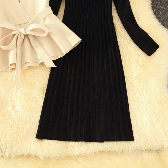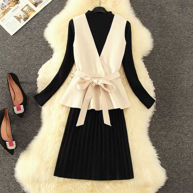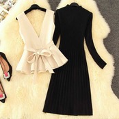 ウエストリボンが印象的なVネックのベスト+ハイネックワンピースのセットアップ♪