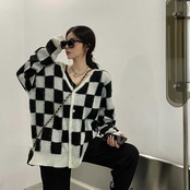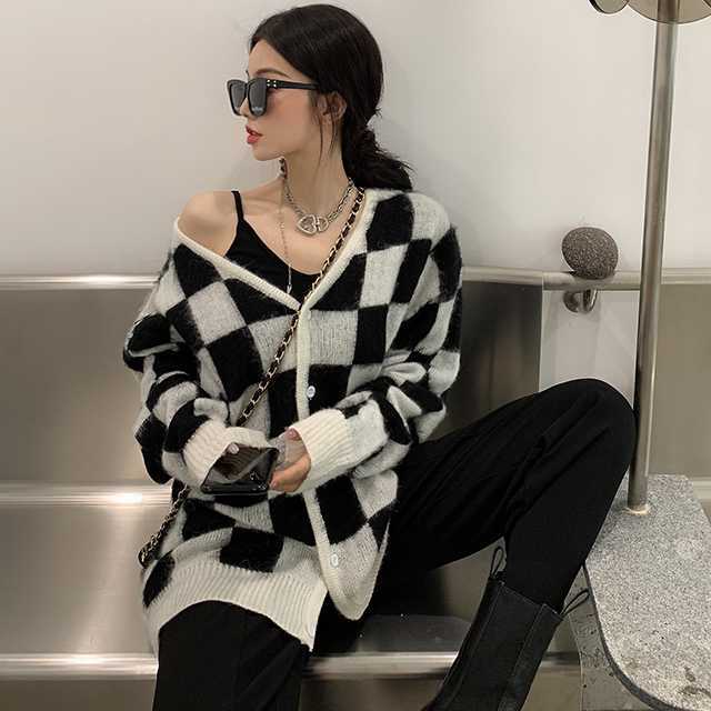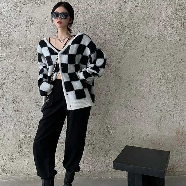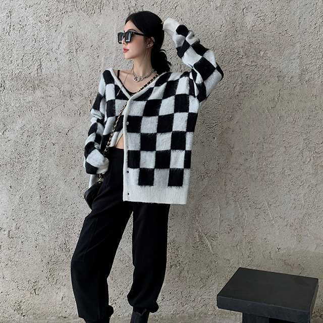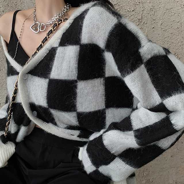 ニット ブルゾン カーディガン レディース アウター 長袖 ボリューム袖 バイカラー 白黒 格子柄 ミドル丈 ロング丈 もこもこ ふわふわ カジュアル 防寒 アウター