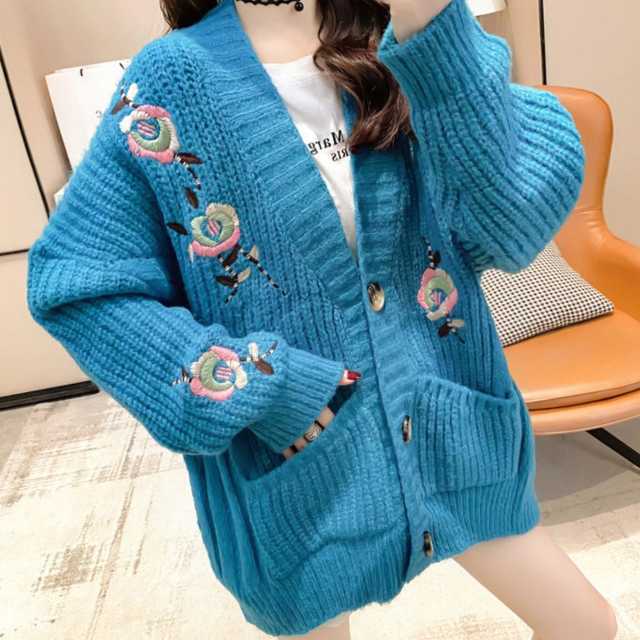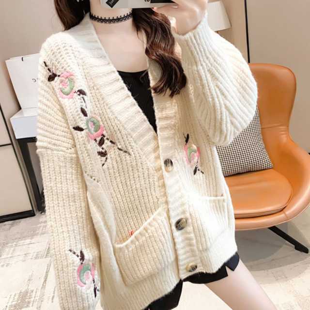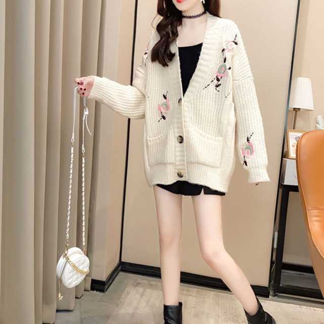 《入荷待ち》 全3色 ニット ブルゾン カーディガン レディース アウター 長袖 ボリューム袖 白黒 刺繍 花柄 ミドル丈 ロング丈 もこもこ ふわふわ キュート カジュアル きれいめ 秋 冬 防寒アウター