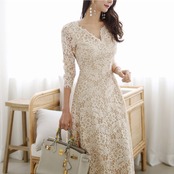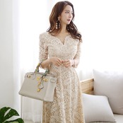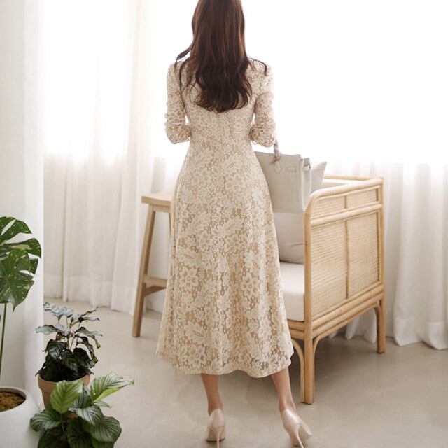レディース パーティー レース かぎ編み Vネック セクシー ミモレ丈 レトロ モダン 大人可愛い ガーリー ドレス