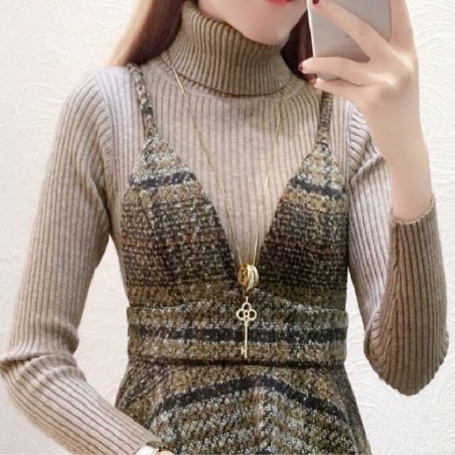 《入荷待ち》大きいサイズ ワンピース セットアップ 重ね着 チェック タートルネック ニット リブ 秋 冬 2020冬 トレ定