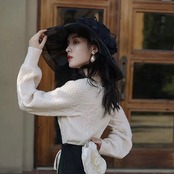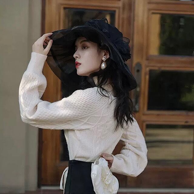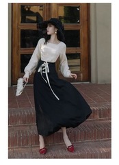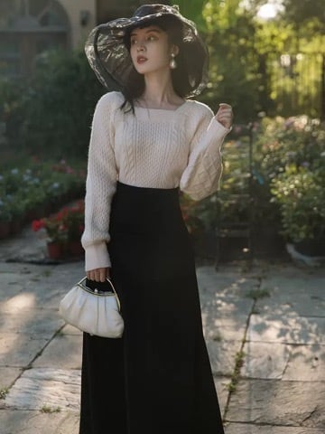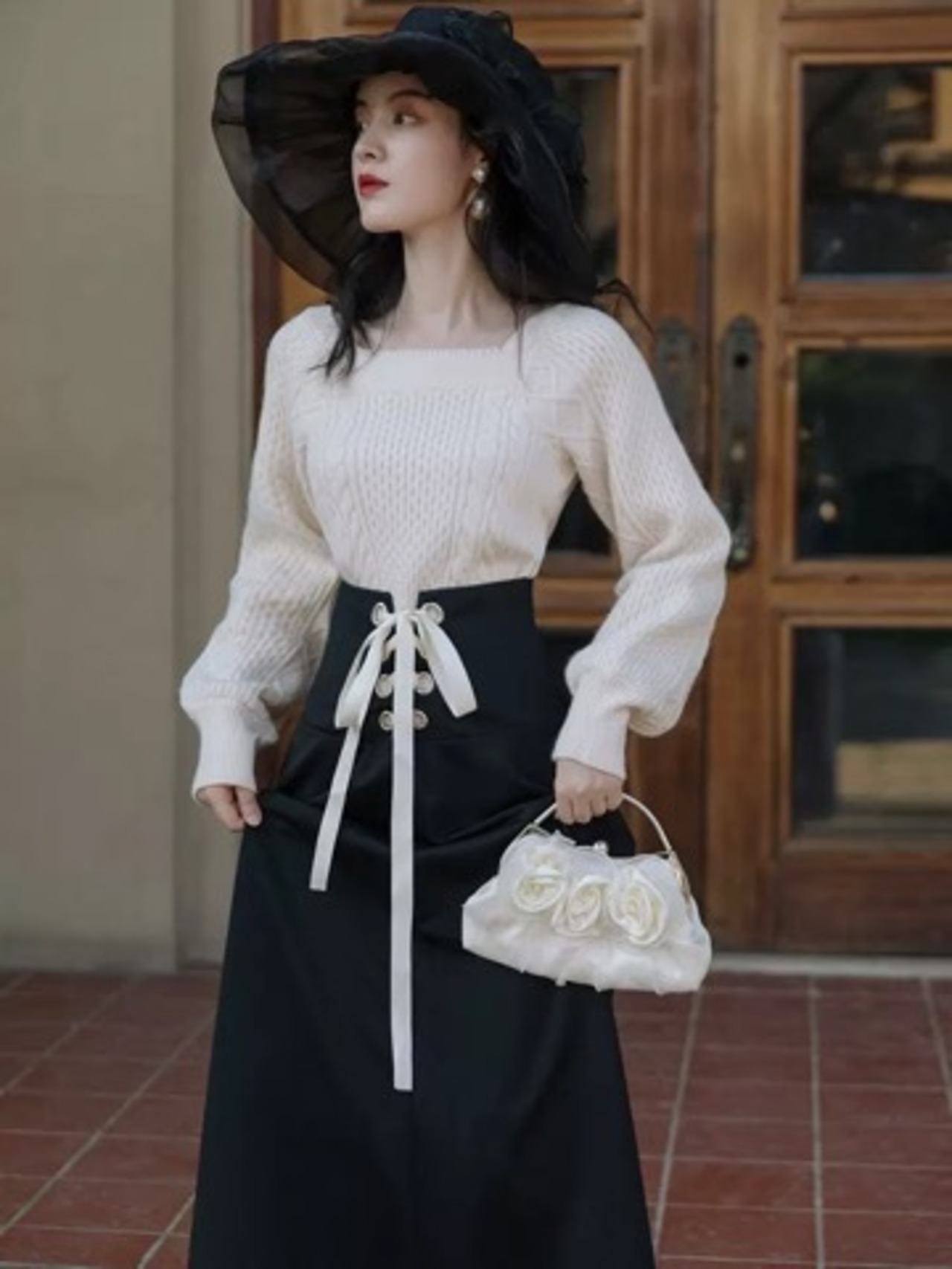 ホワイトのセーターとブラックのスカートのツーピースのセットアップ商品です。