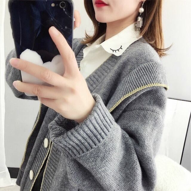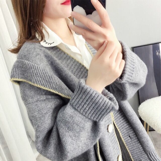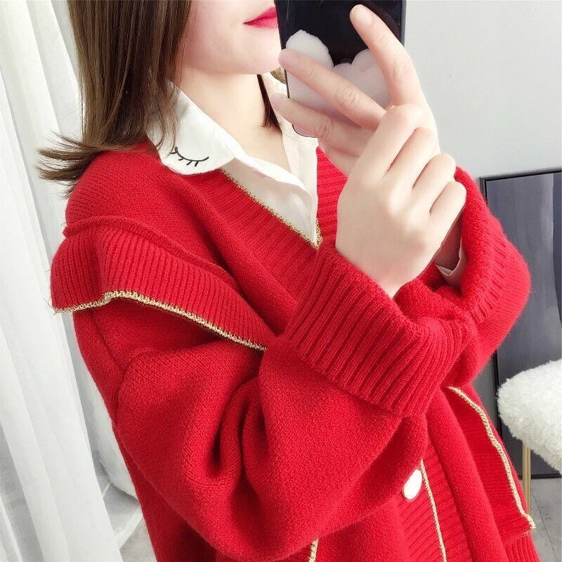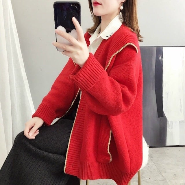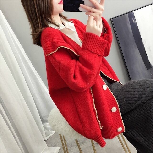 《入荷待ち》全4色 レディース ニット カーディガン フリル ゴールドライン ボタン 長袖 ロング あったか 大人可愛い おじかわ ガーリー アウター トレ定 かわ大
