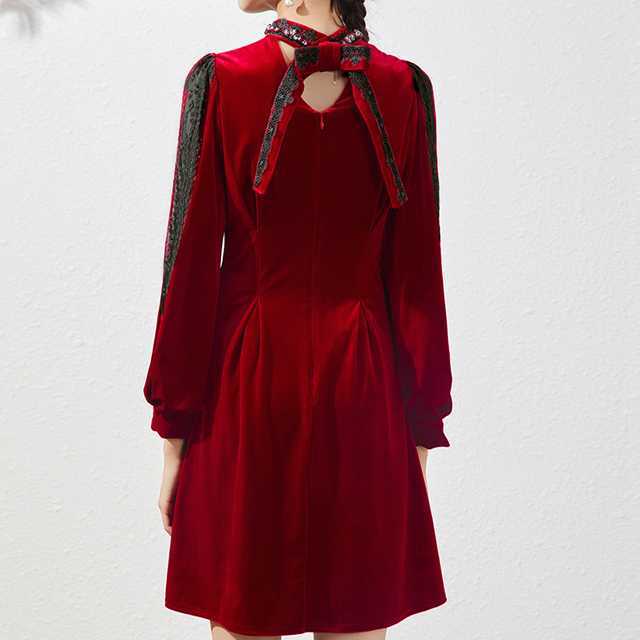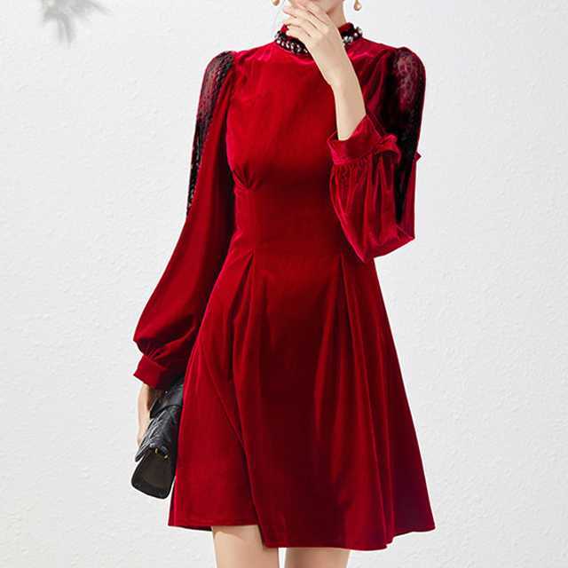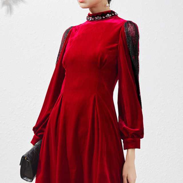 《再入荷》 全2色 パーティードレス ミモレ丈 ハイネック シースルー レース 透け袖 長袖 ワンピース Aライン ビジュー パーティードレス ベルベット 大きいサイズ ドレス