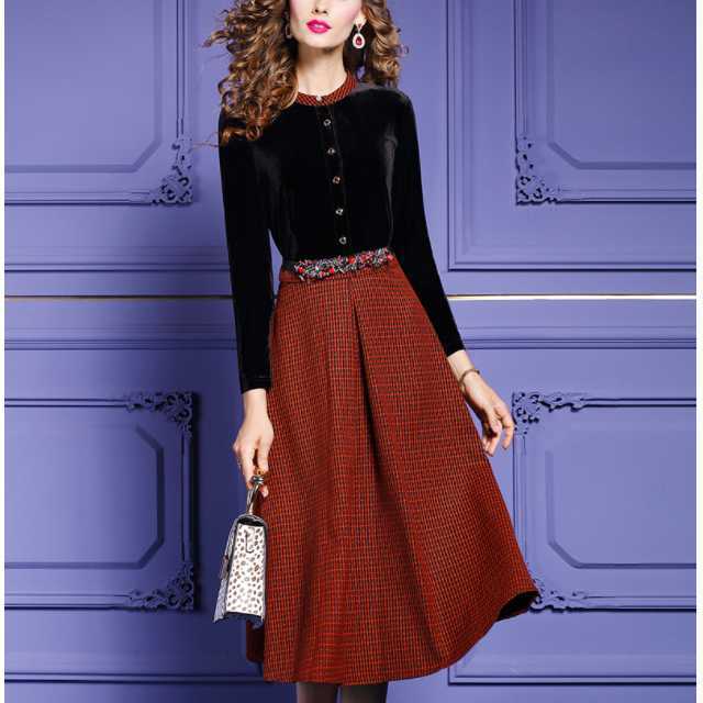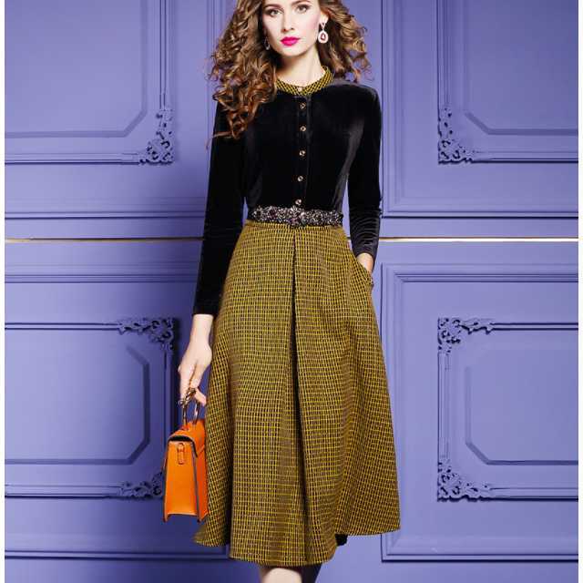 《入荷待ち》 全2色 ドレス ミモレ丈 長袖 ワンピース Aライン ハイウエスト パーティードレス ベルベット 異素材MIX 大きいサイズ ドレス かわ大