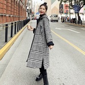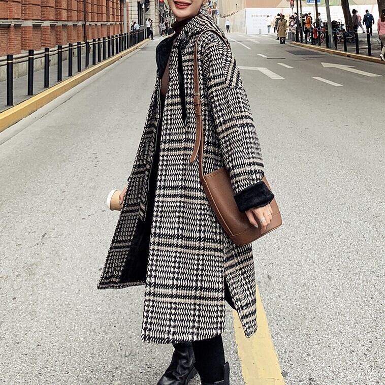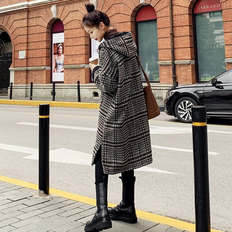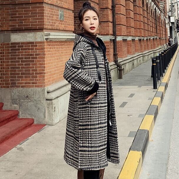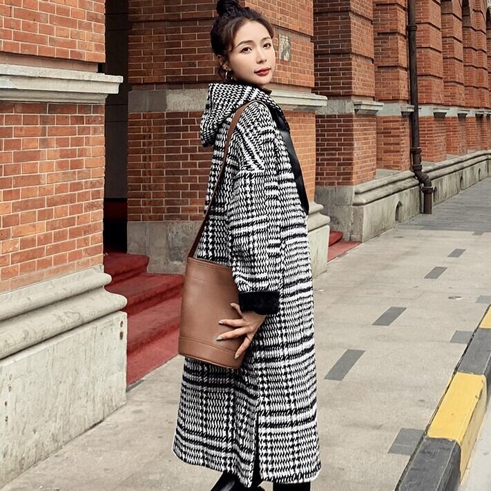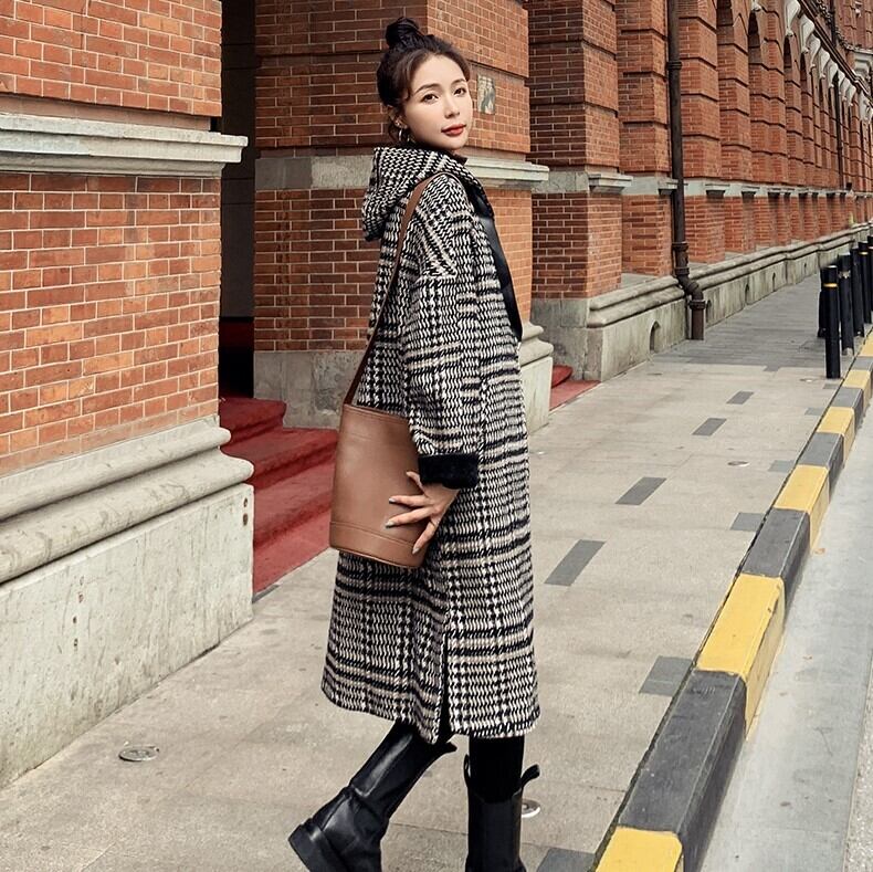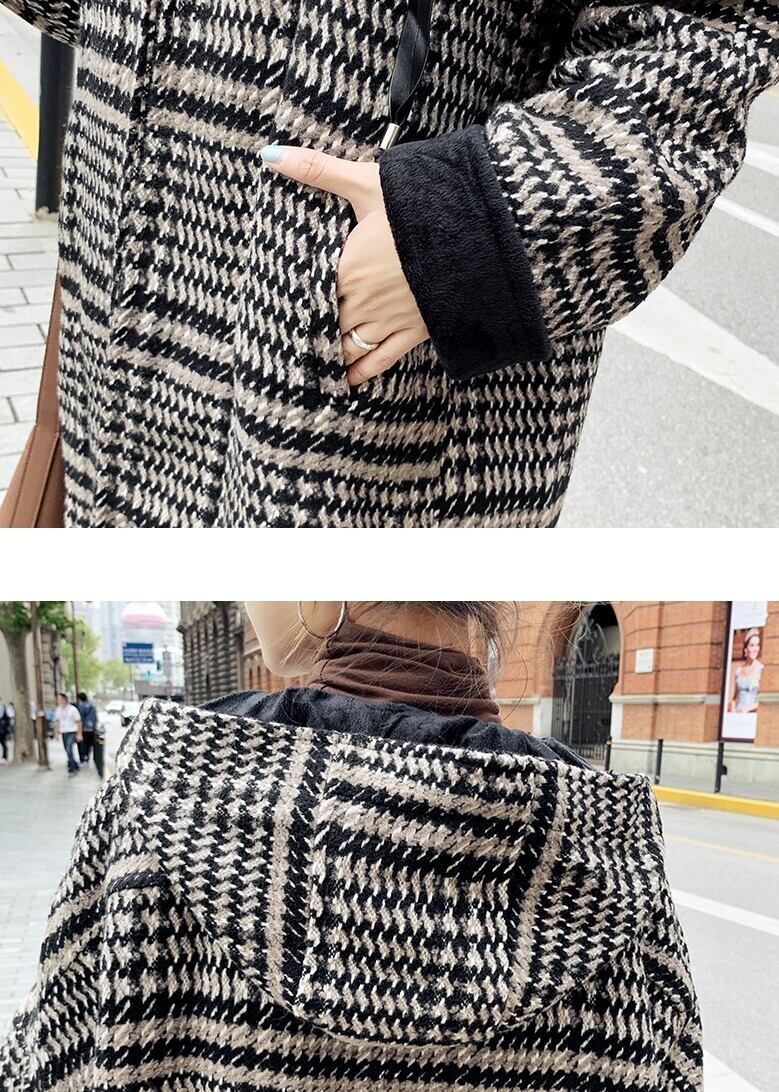大人っぽい千鳥格子柄にフードが付いたジップアップコート。