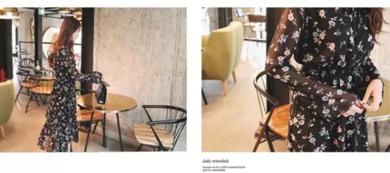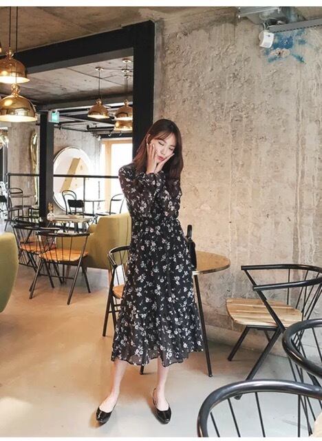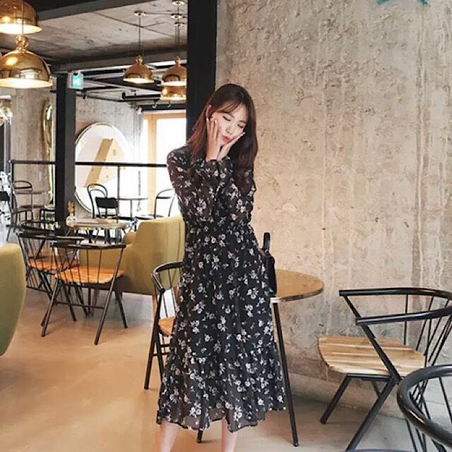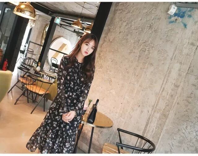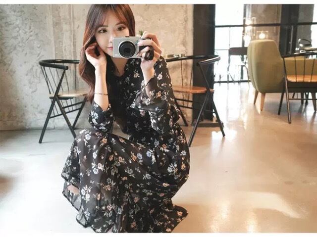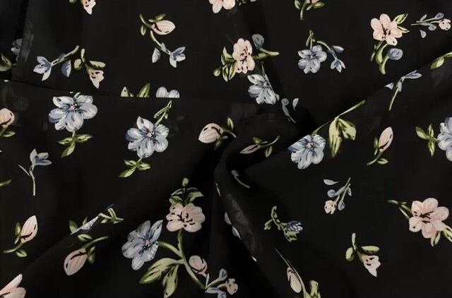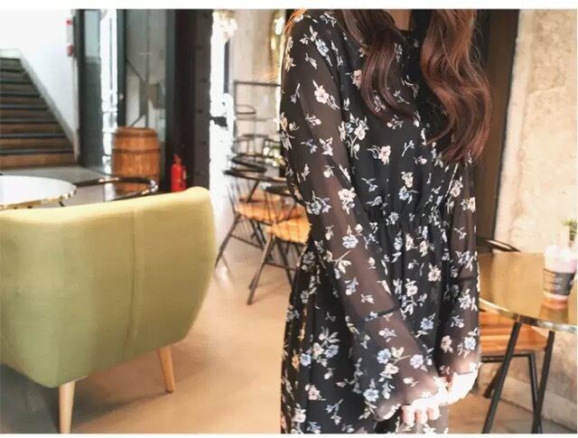 漆黒の闇に、お花を散りばめたような花柄のらシフォンワンピースです。