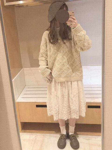 黒や赤と合わせるとナチュラルコーデに出来るので大人っぽくも、フェミニンにもできるスカート。