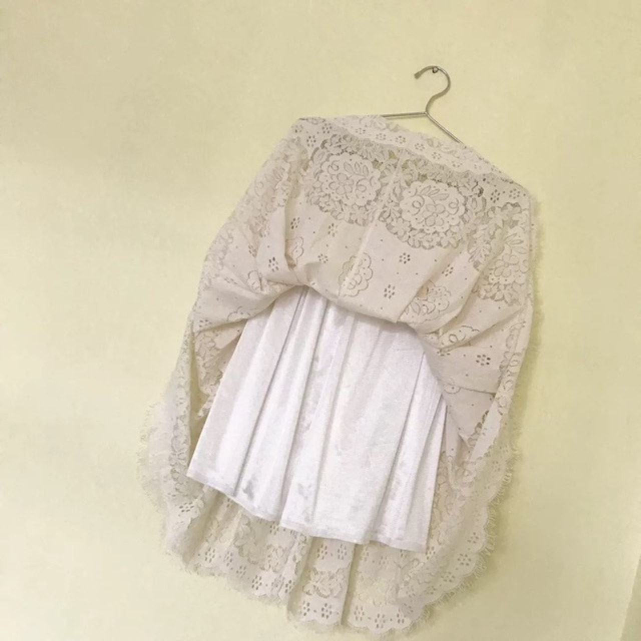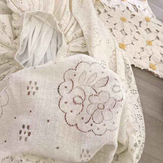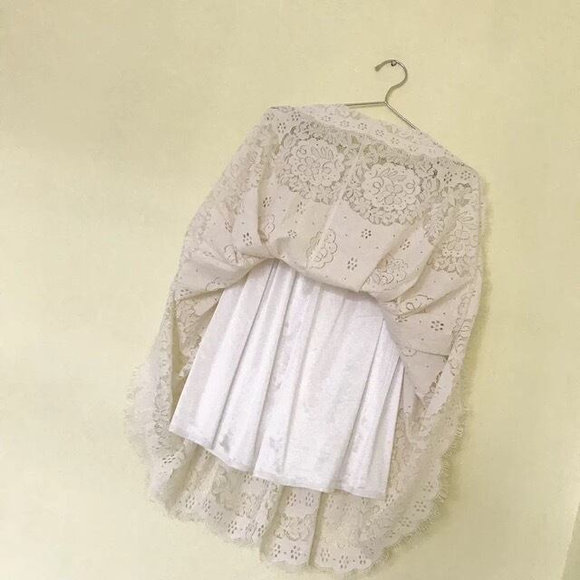 いくつもの花をデザインしたミディ丈の透かし編みスカート。