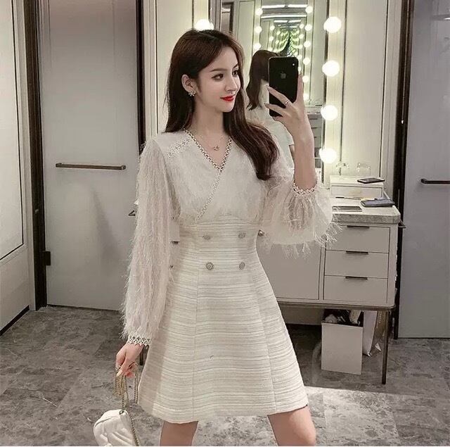 異素材MIXの長袖ワンピースの登場です。