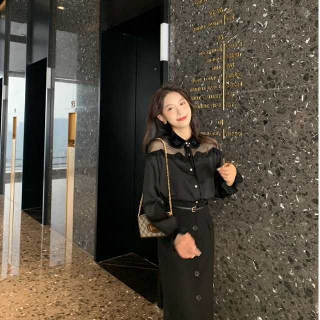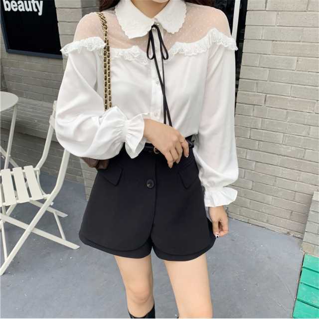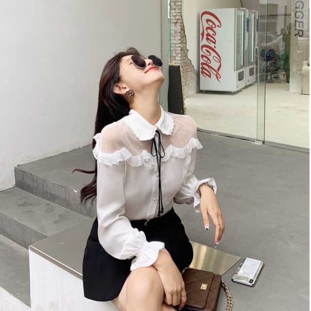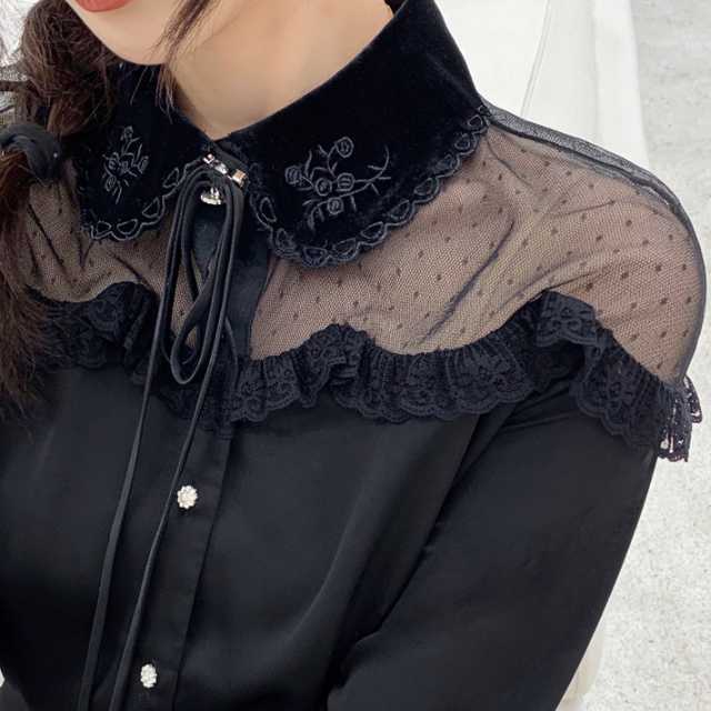 肩からデコルテラインがシースルー生地になった大人かわいい異素材MIXブラウス♪