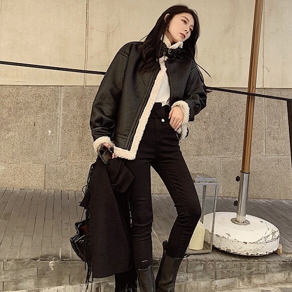 クールな印象のライダースジャケットですが、ボアがあるので大人可愛くなります。