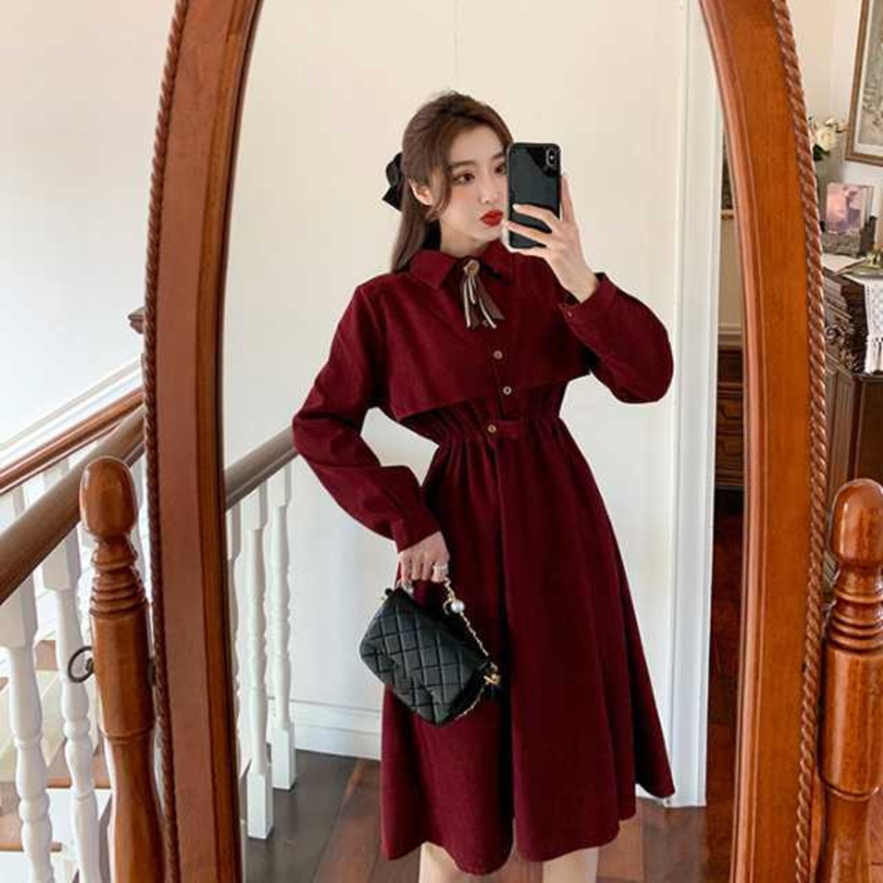 襟元には落ち着いたリボンタイをあしらい、程よいミモレ丈は