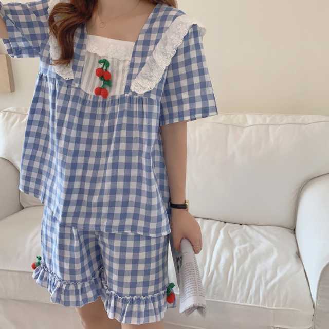 全2色 パジャマ レディース チェック柄 ギンガムチェック 上下セット 2点セット レース 長袖 ロング丈 セットアップ ルームウエア ナイトウエア 寝間着 部屋着 キュート かわいい 半袖