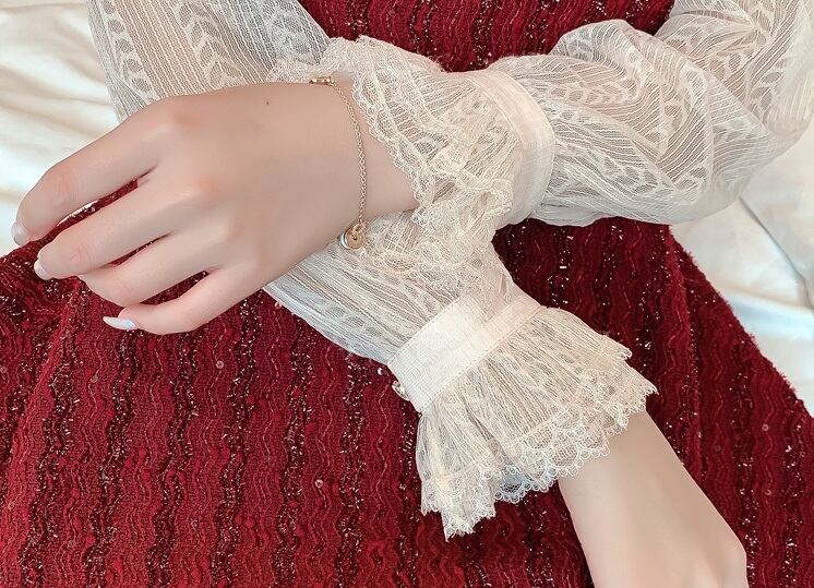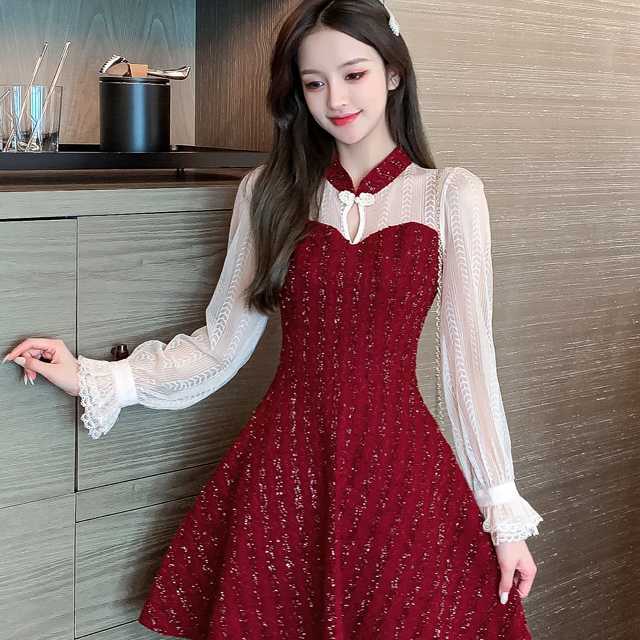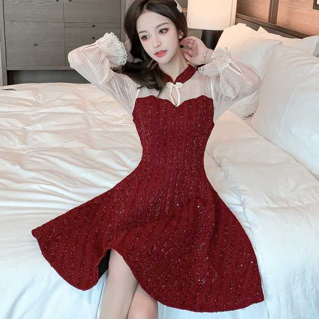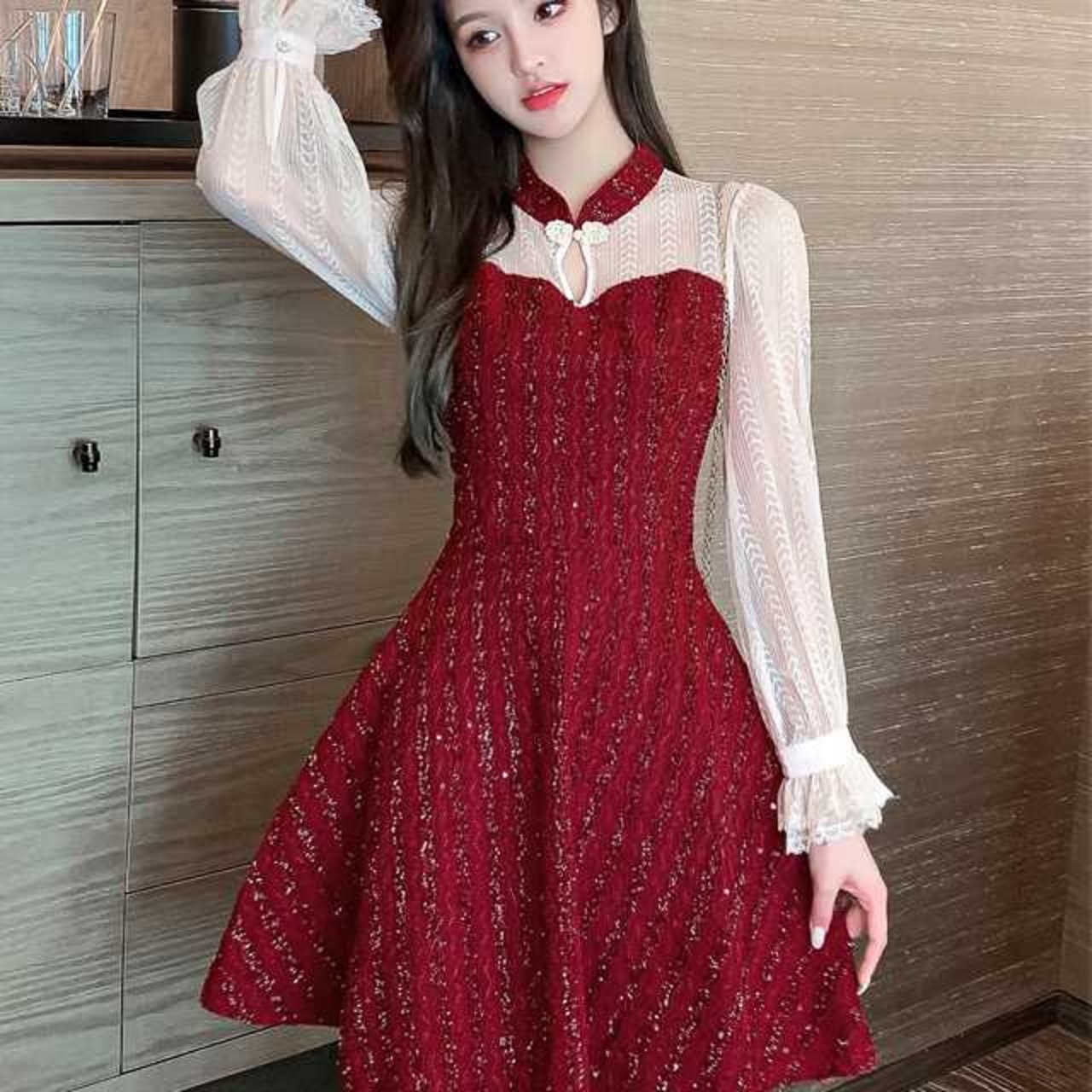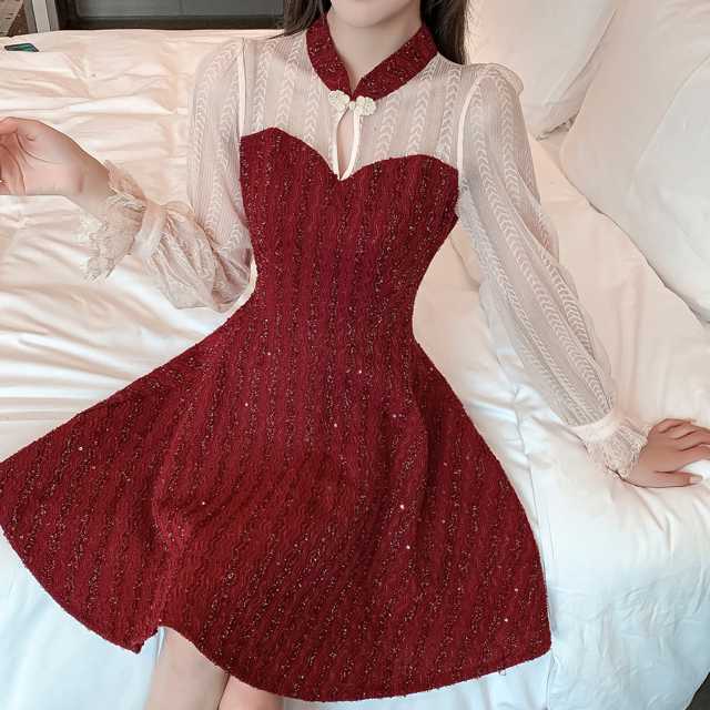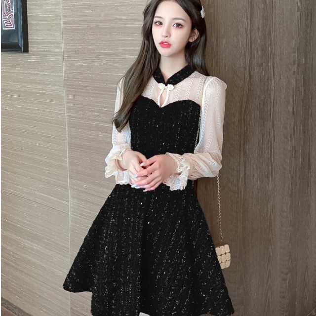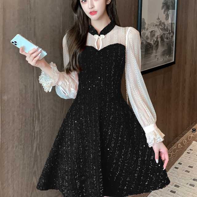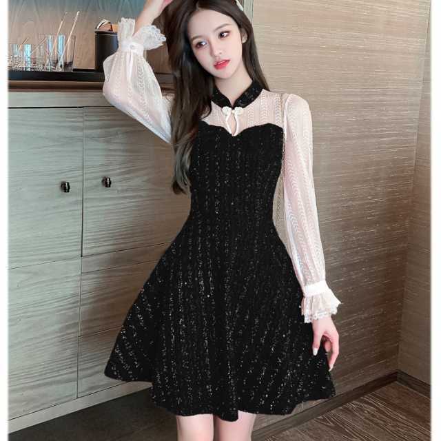 《入荷待ち》全2色 ワンピース ミニワンピース クパーティードレス レディース ビジュー ラメ シースルー パーティーワンピース ワンピ 可愛い レース オシャレ ワンピース 華やかさ ミディ丈 異素材MIX 長袖 カワイイ 夢かわ