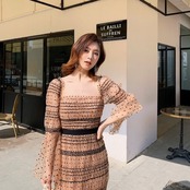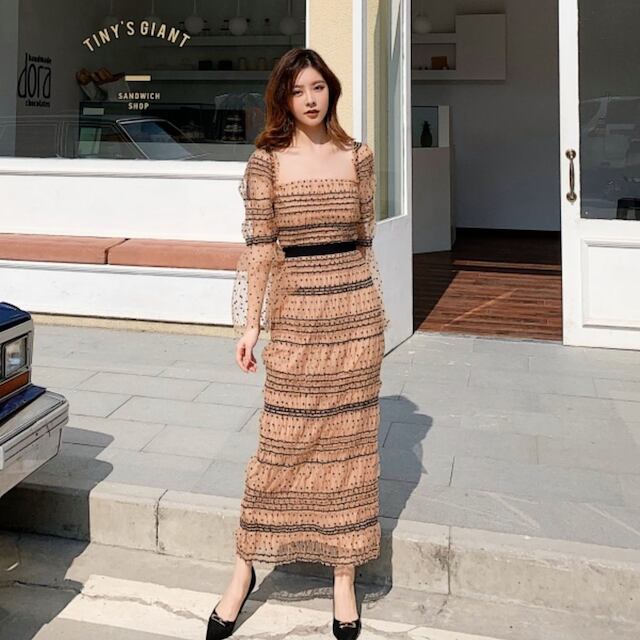 マキシ丈のスカートやシアー素材の袖で着痩せ効果もバッチリ。