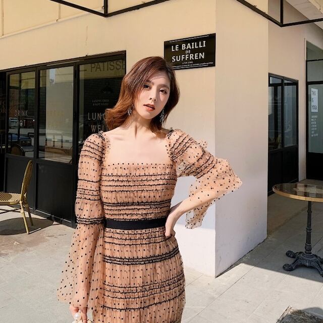 《入荷待ち》ワンピース マキシ丈 ロング丈 透け感 シアー 着痩せ ヘルシー 上品 ドット シフォン ゴム デコルテ見せ 着痩せ 春 秋 トレ定 かわ大