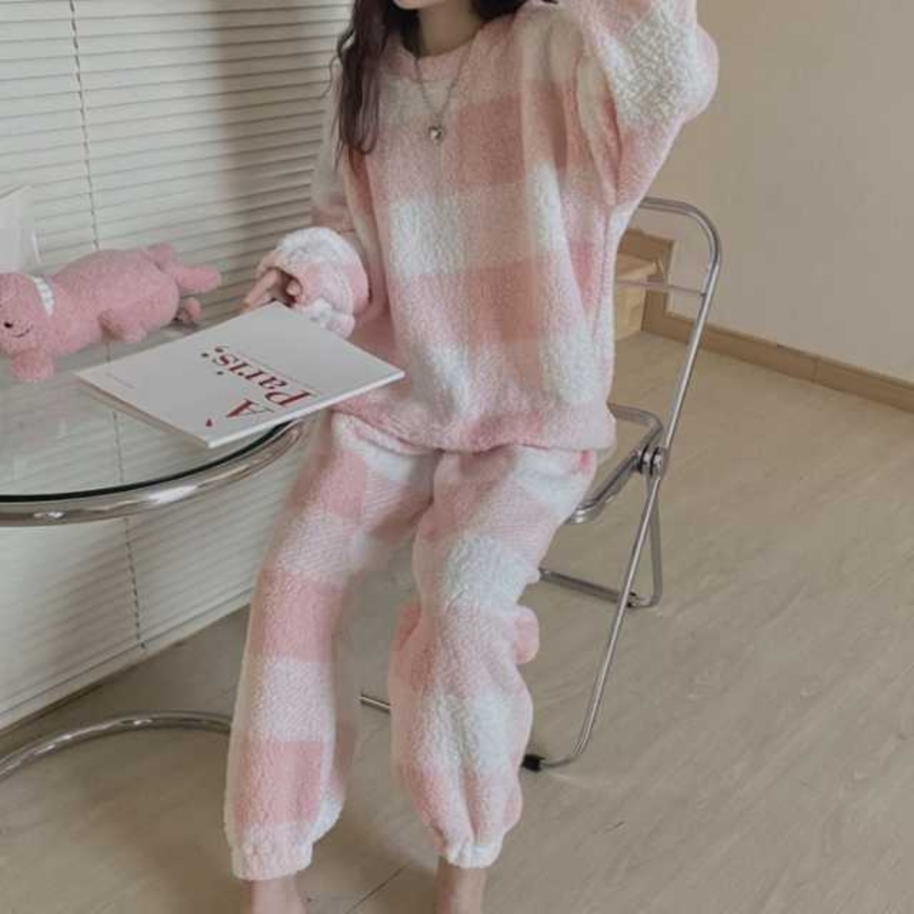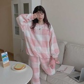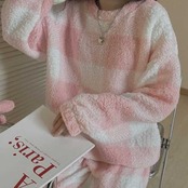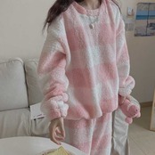 ピンクのスクエア模様がふんわり優しい印象のカジュアルルームウェア♪