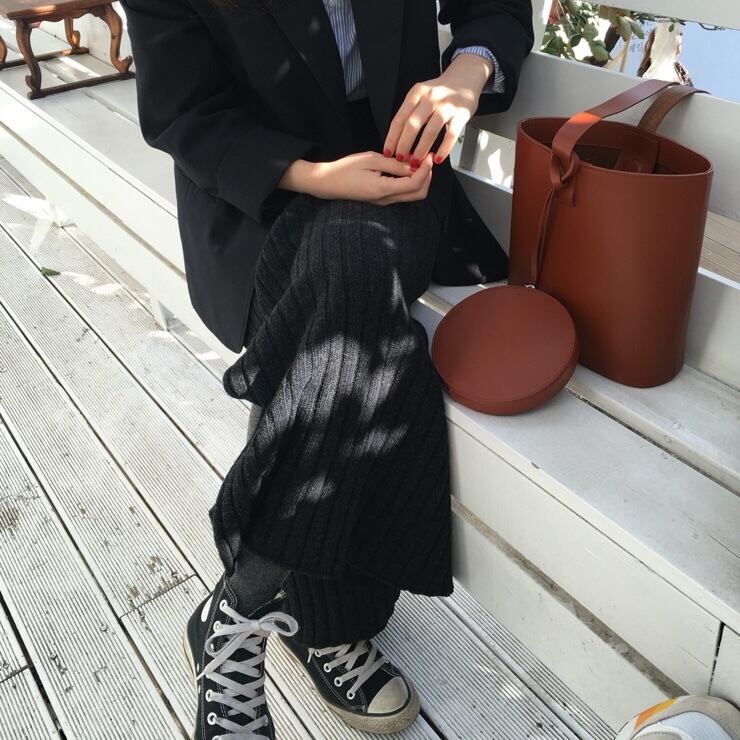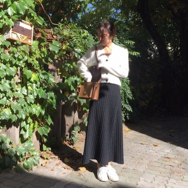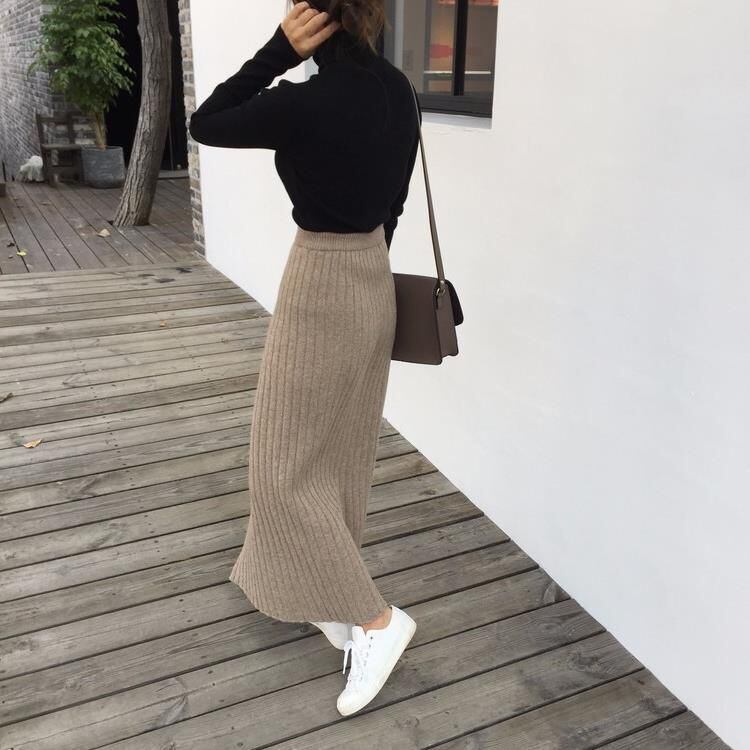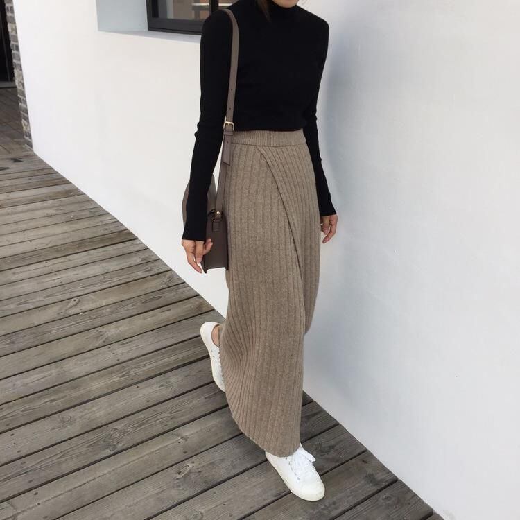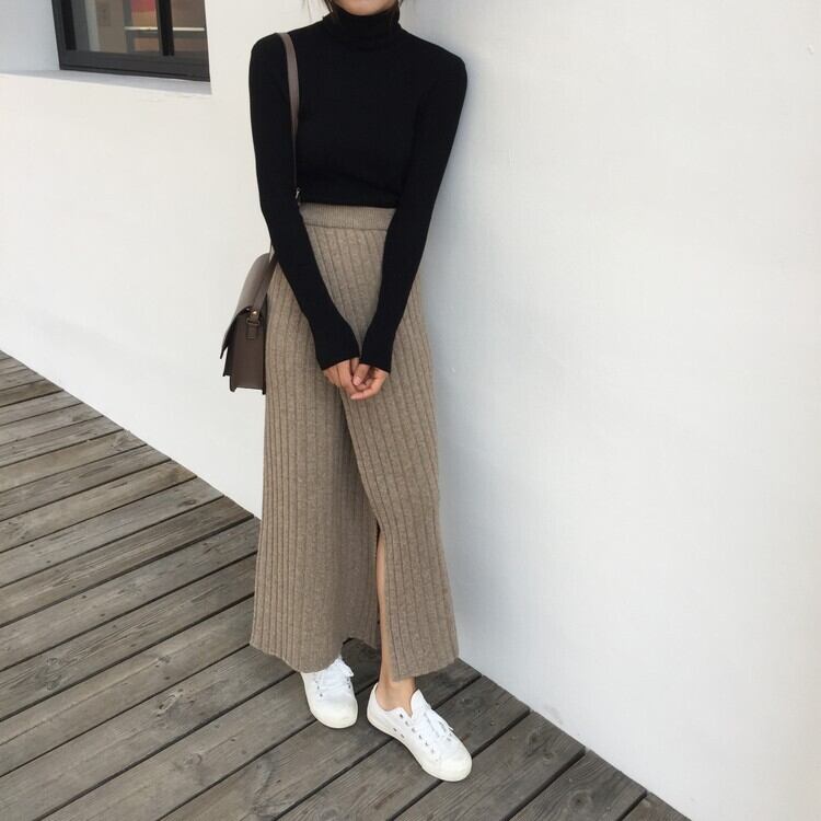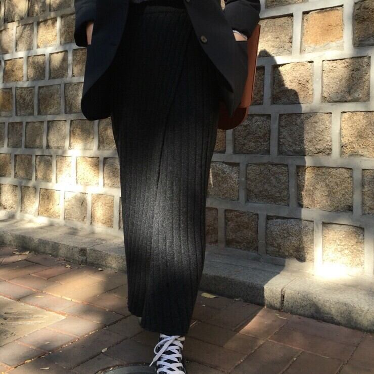 全2色 小さいサイズ レディース リブ ニット ラップ スカート ロング丈 ミモレ丈 タイト ウエストゴム スリット シンプル 大人カジュアル ナチュラル きれカジ 秋 冬 キレナチュ