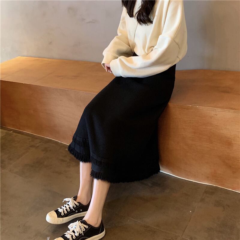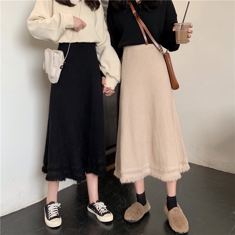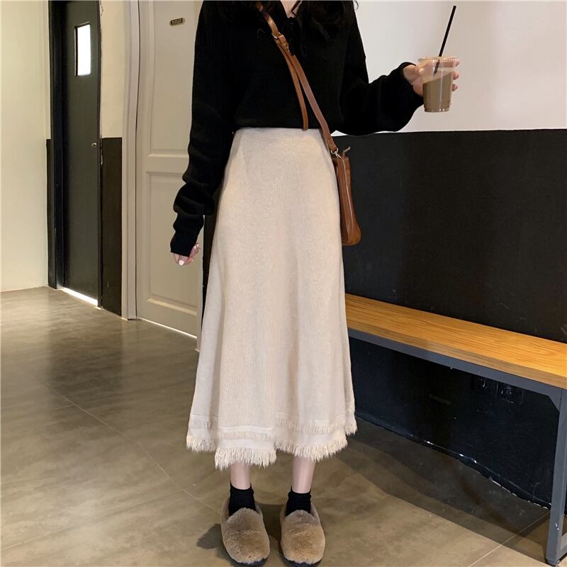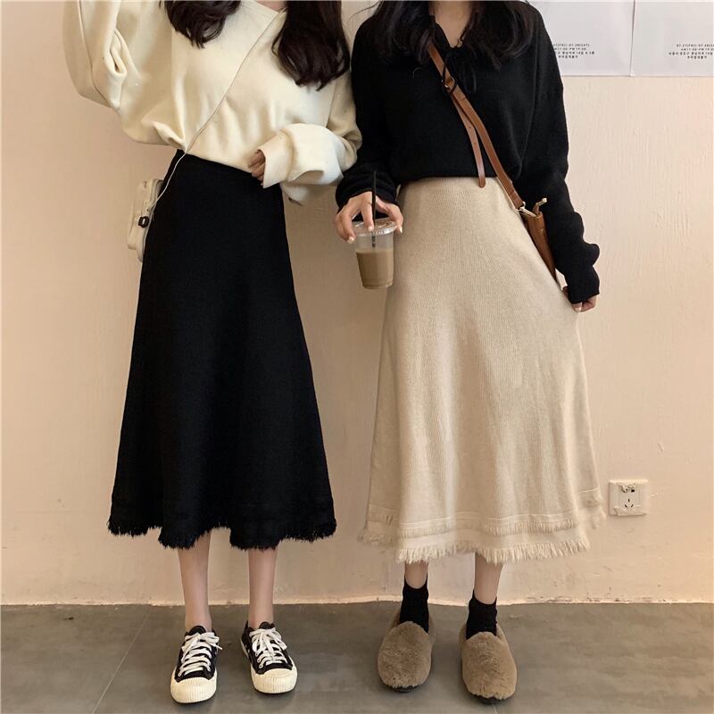 《入荷待ち》 全2色 レディース ボトムス ニット フレア スカート フリンジ ミドル丈 ミモレ丈 Aライン ハイウエスト ウエストゴム フェミニン きれいめ シンプル ナチュラル 秋 冬 キレナチュ