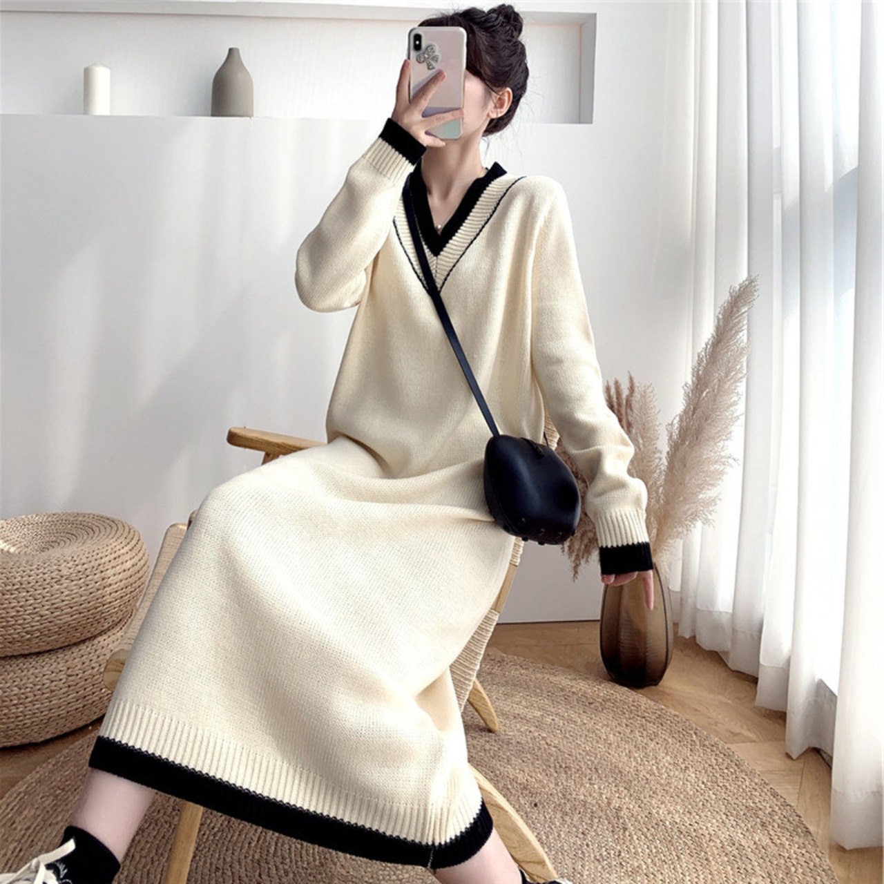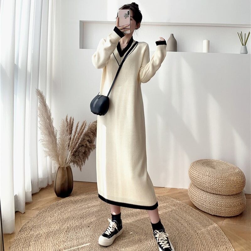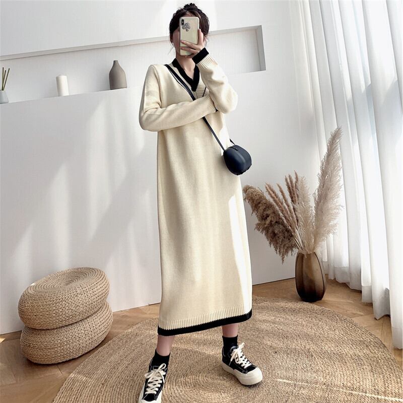 大きいサイズ 小さいサイズ レディース ワンピース チルデン ニット Vネック ミモレ丈 ミドル丈 バイカラー 長袖 ゆったり ナチュラル カジュアル キレカジ 秋 冬 かわ大 キレナチュ