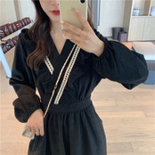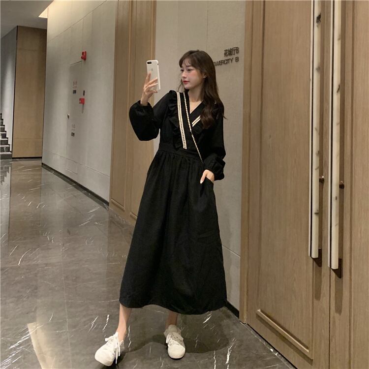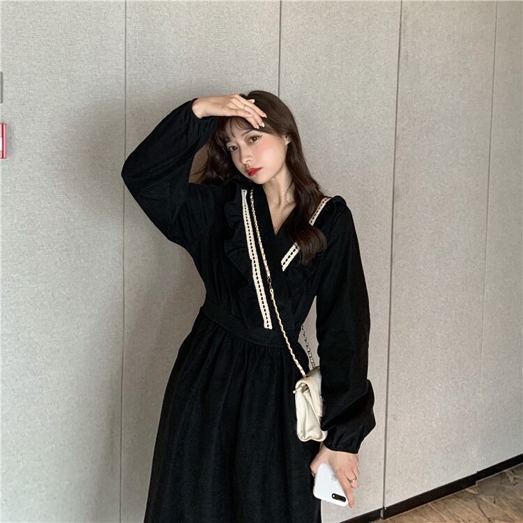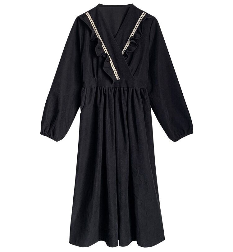《入荷待ち》レディース ワンピース Vネック ミモレ丈 フリル ハイウエスト カシュクール Aライン 長袖 ナチュラル カジュアル レトロ フェミニン 春 秋 キレナチュ
